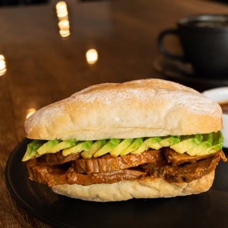 Jugosas lonjas de asado y trozos de palta en pan ciabatta tostado.