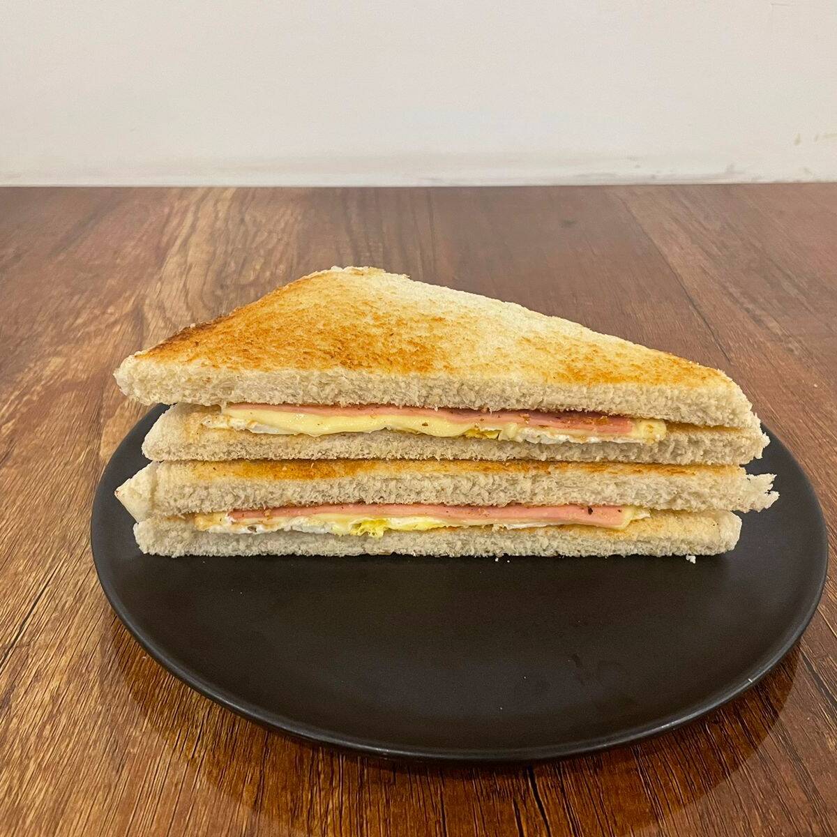 Pan tostado, jamón, queso, huevo frito y un toque de mayonesa de la casa