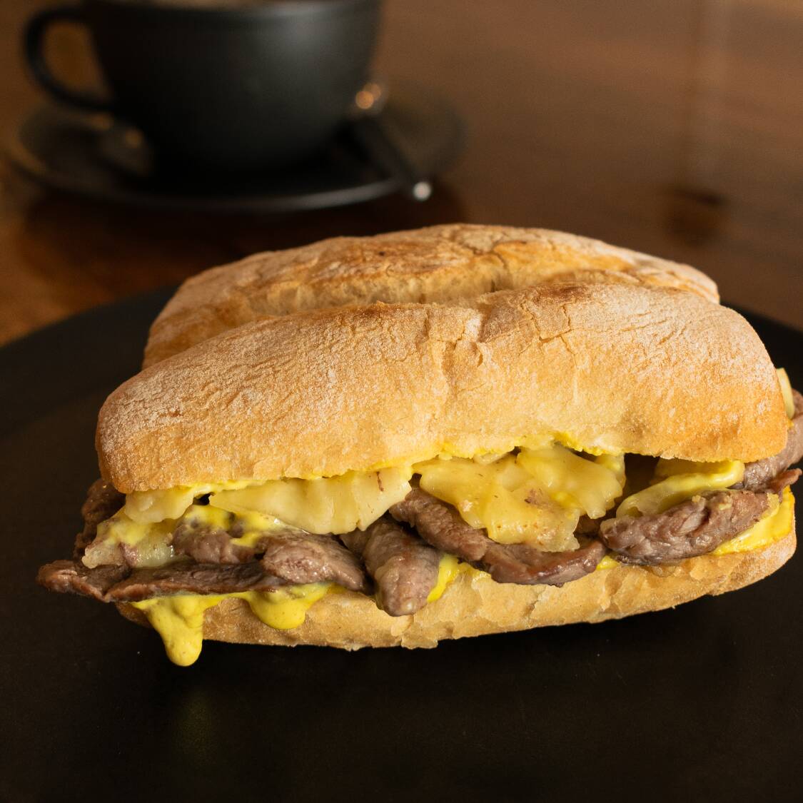 Lomito a la plancha, queso derretido, un toque de ajo y mayomostaza en pan ciabatta.