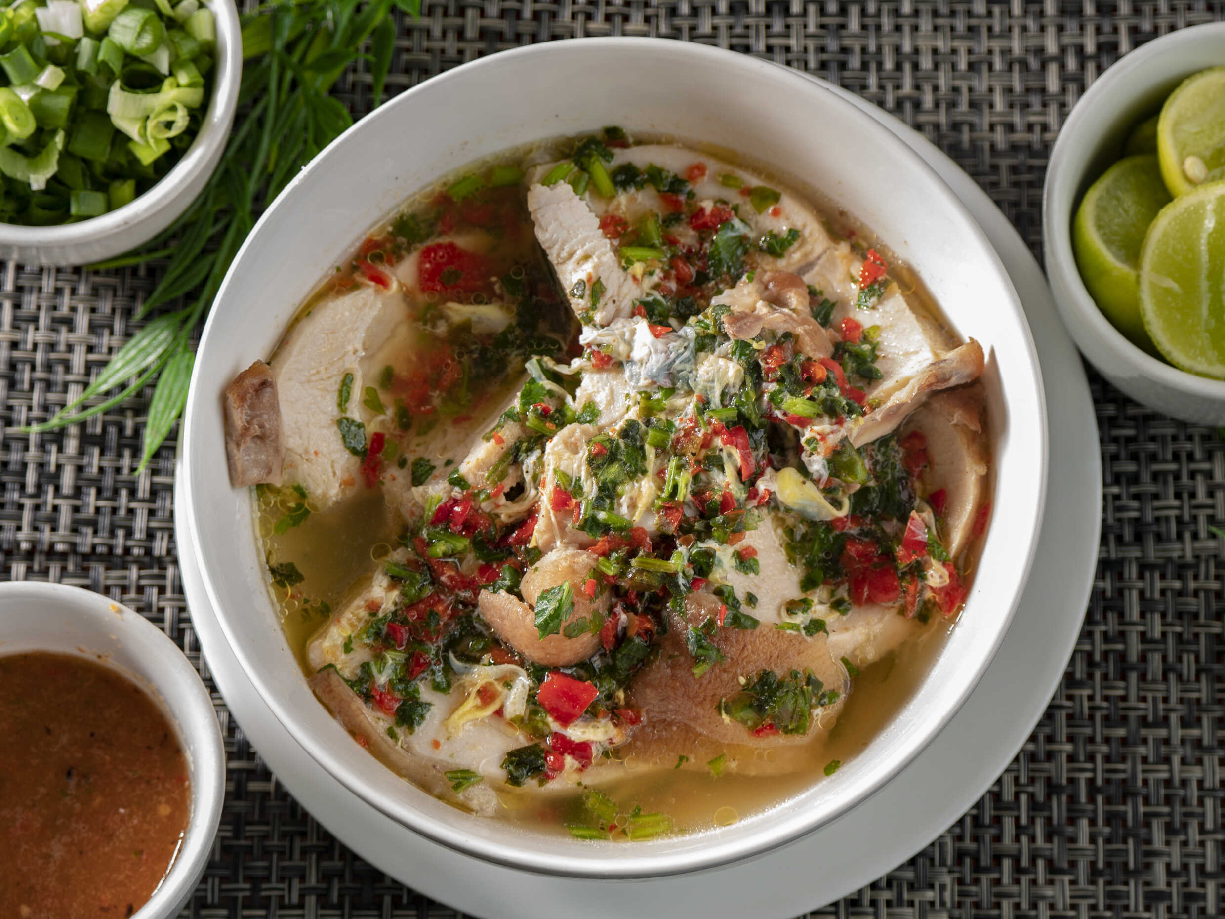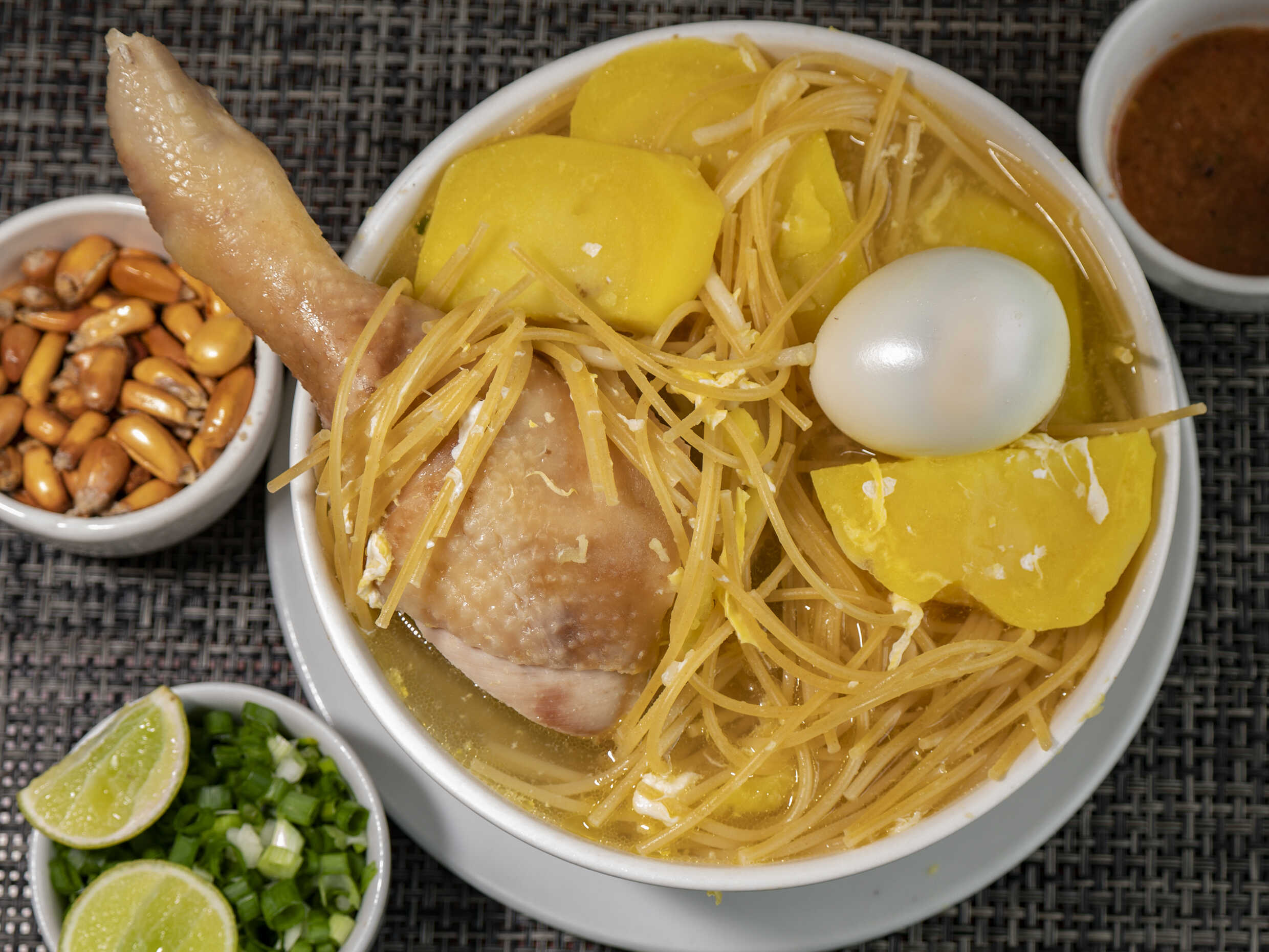 Caldo de gallina en salsa acevichada con fideos al dente, papa amarilla y huevo duro, acompañado de canchita, cebolla china, limón y rocoto.