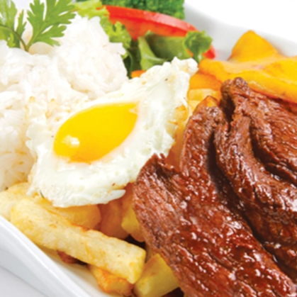 120 g De bistec a la plancha acompañado de plátano frito, arroz, papas fritas y huevo a la inglesa.
