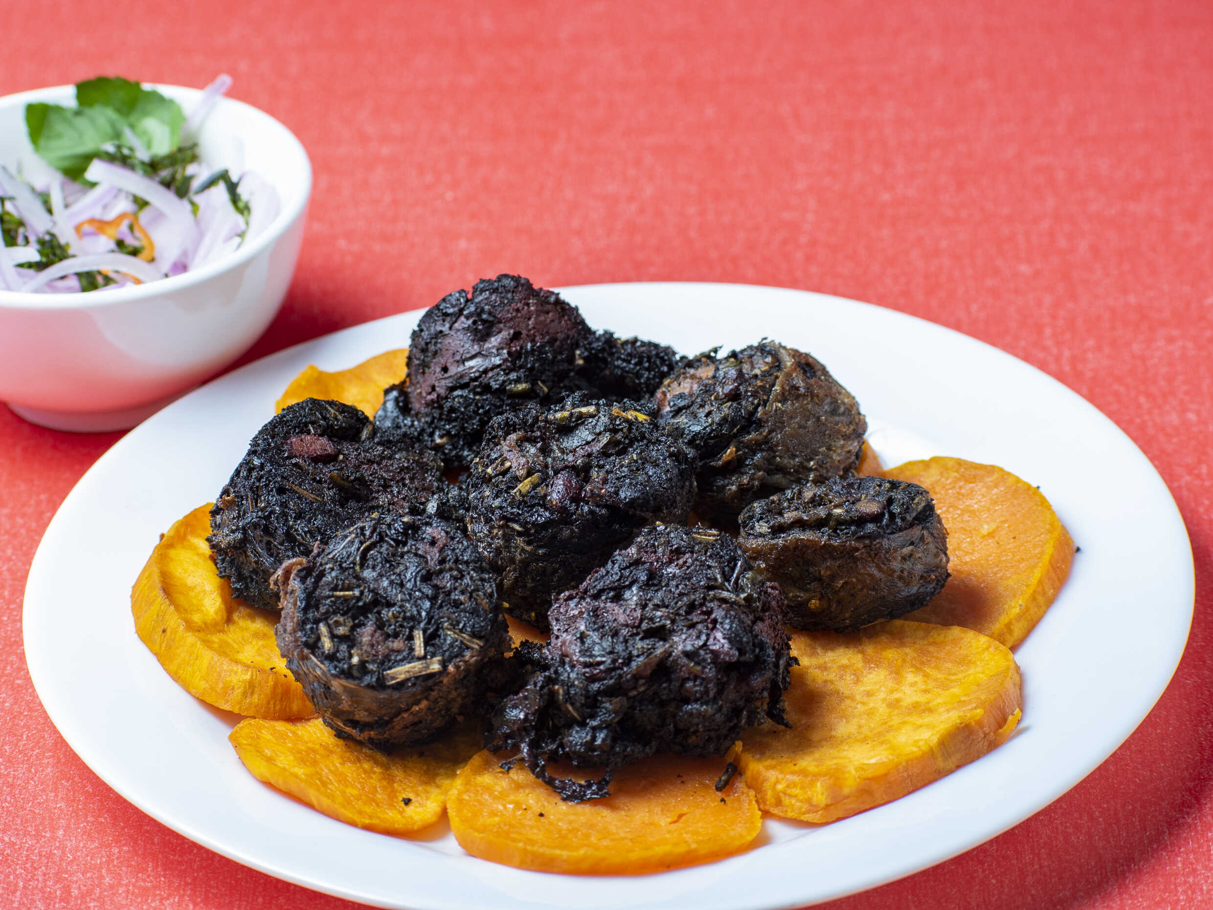 Pan con salchicha huachana, camote frito y sarza de cebolla.