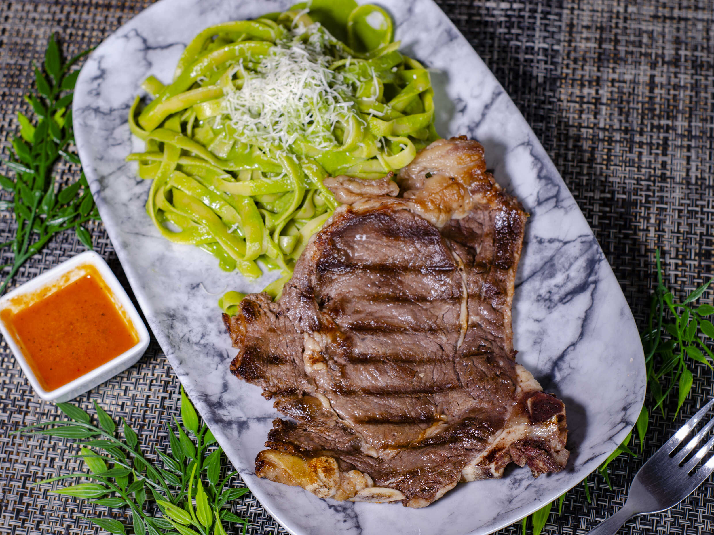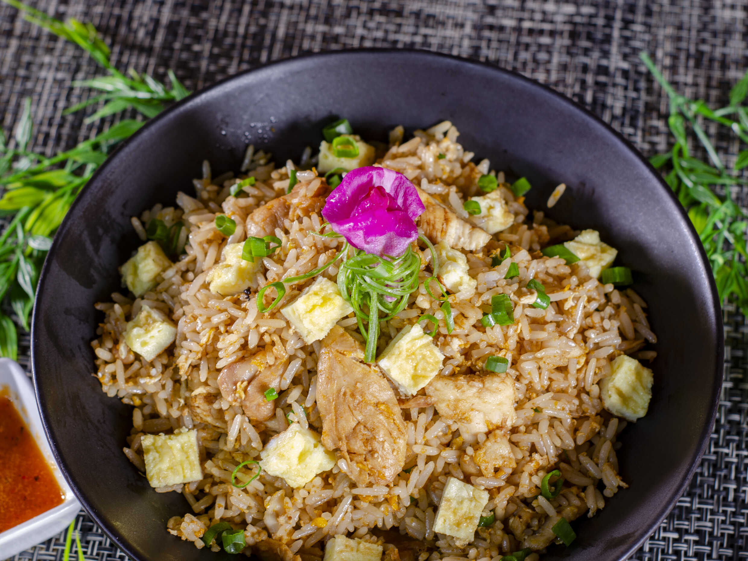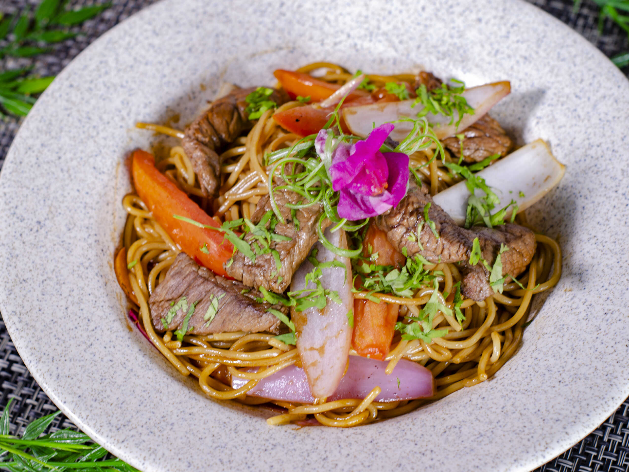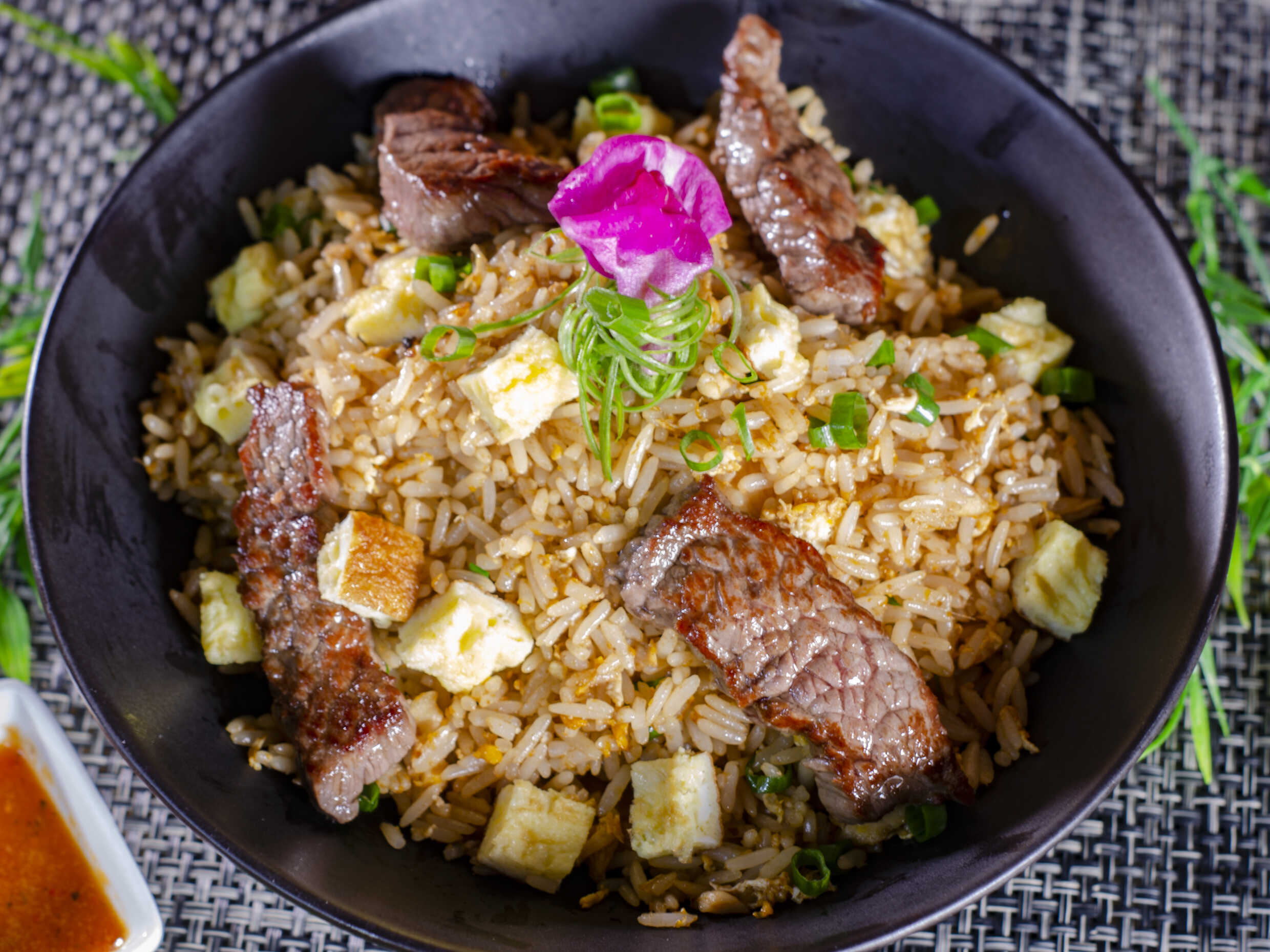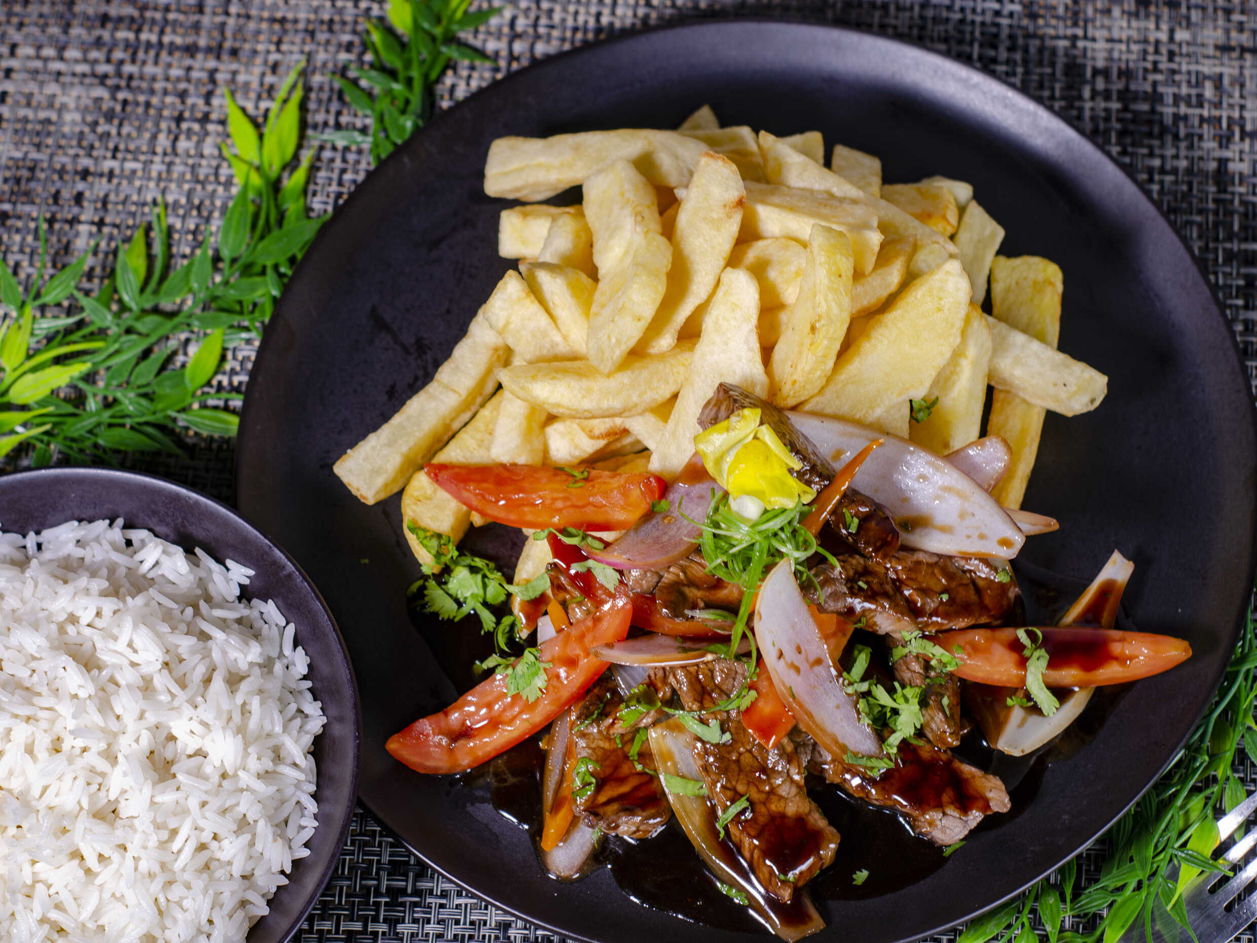 Arroz frito cubiertos con una tortilla de huevo batido y una porción de lomo al jugo de la casa.