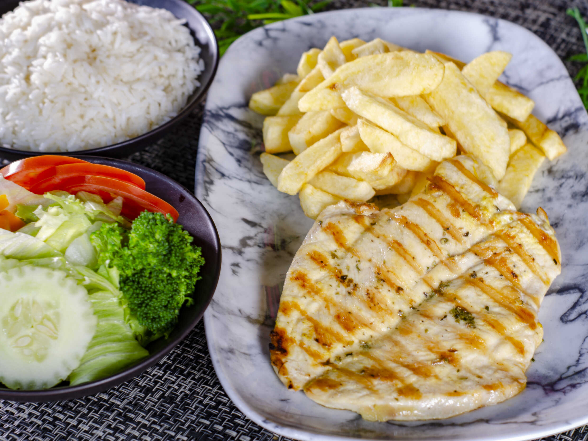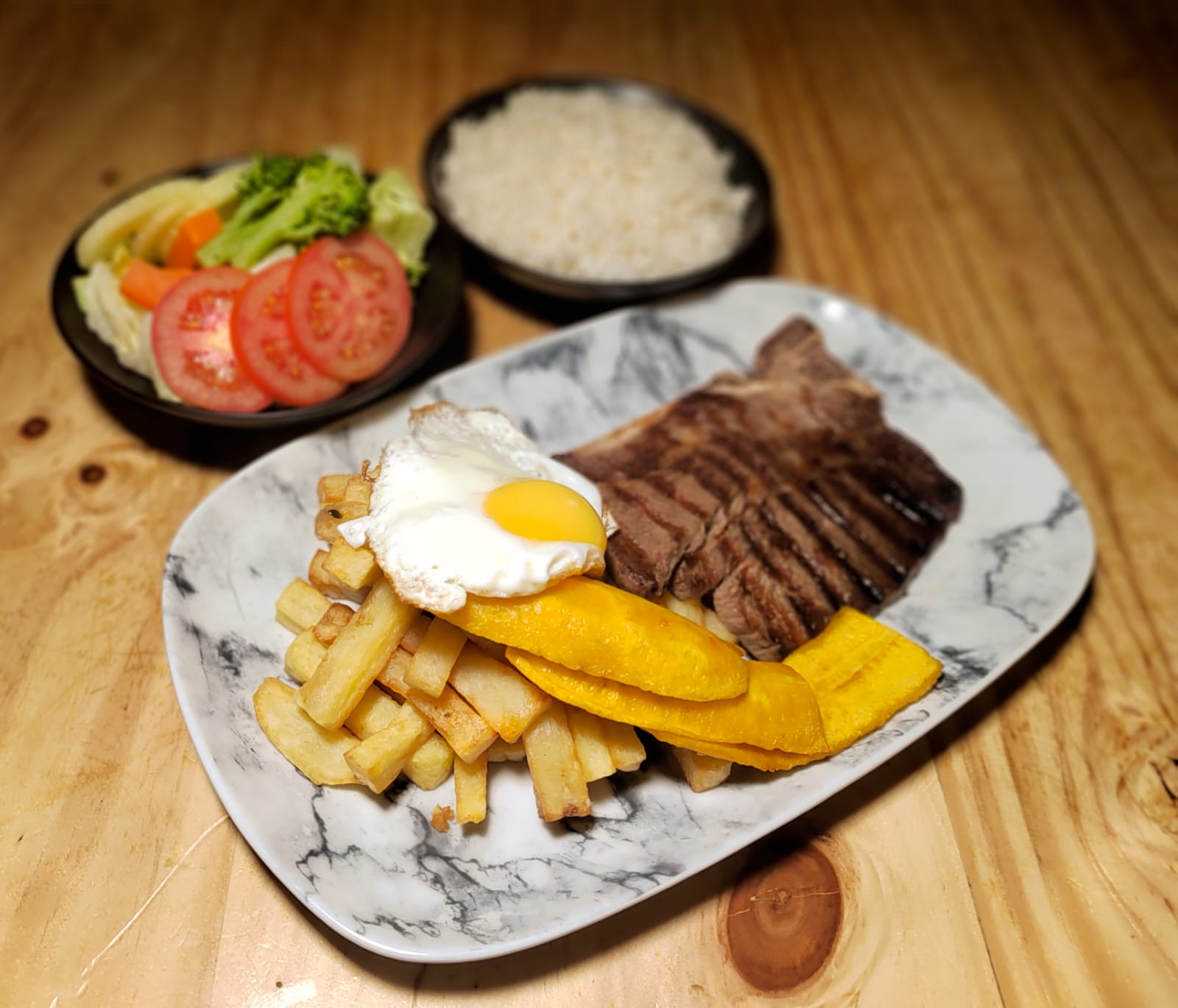 Con papas fritas, ensalada, huevo montado, plátano y Arroz.