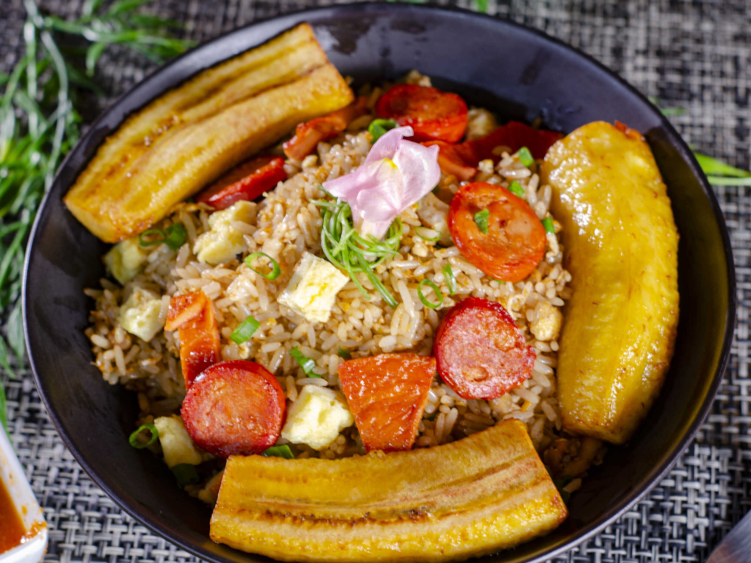 ARROZ ACOMPAÑADO DE 2 HUEVOS FRITOS Y PLATANOS FRITO