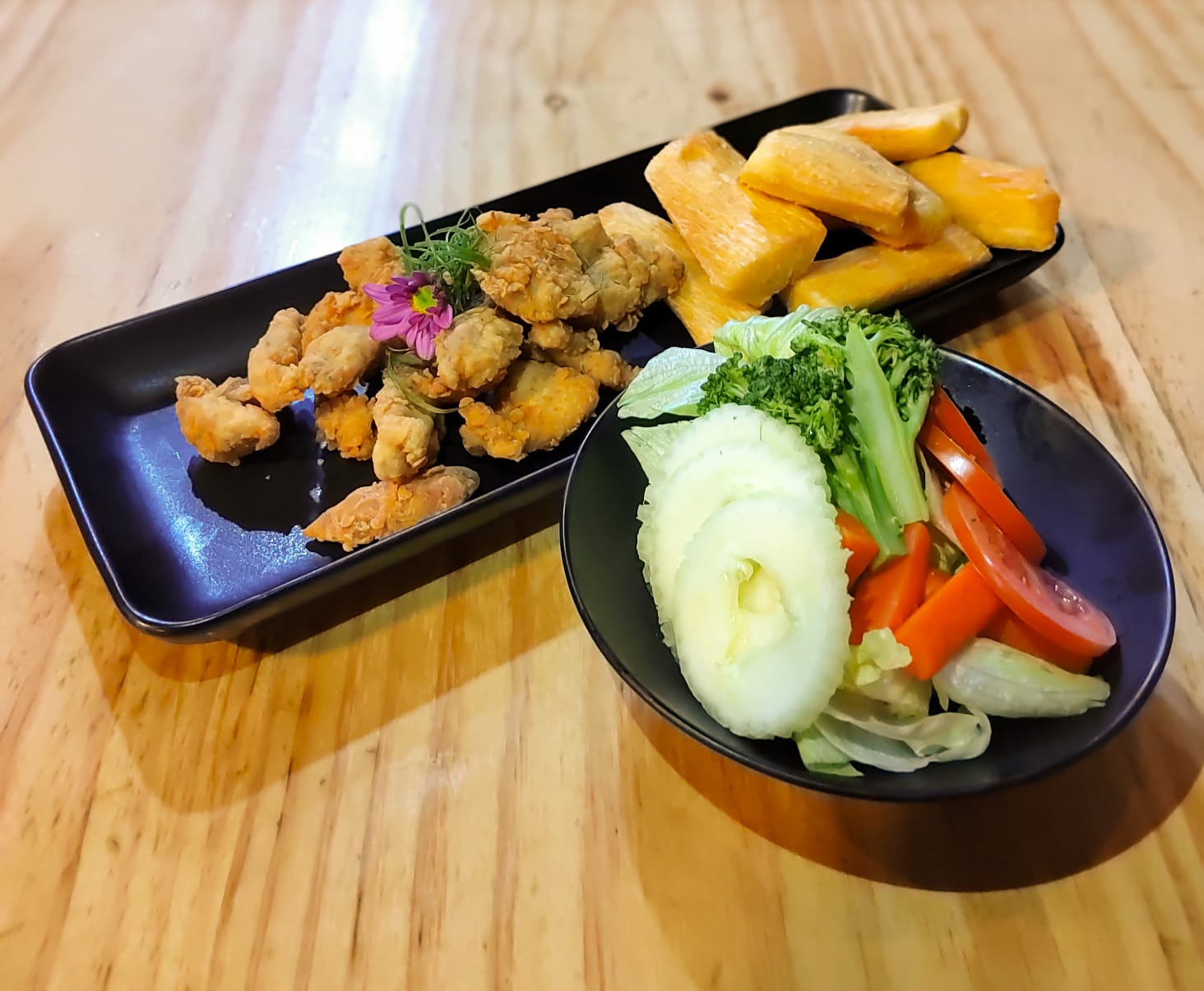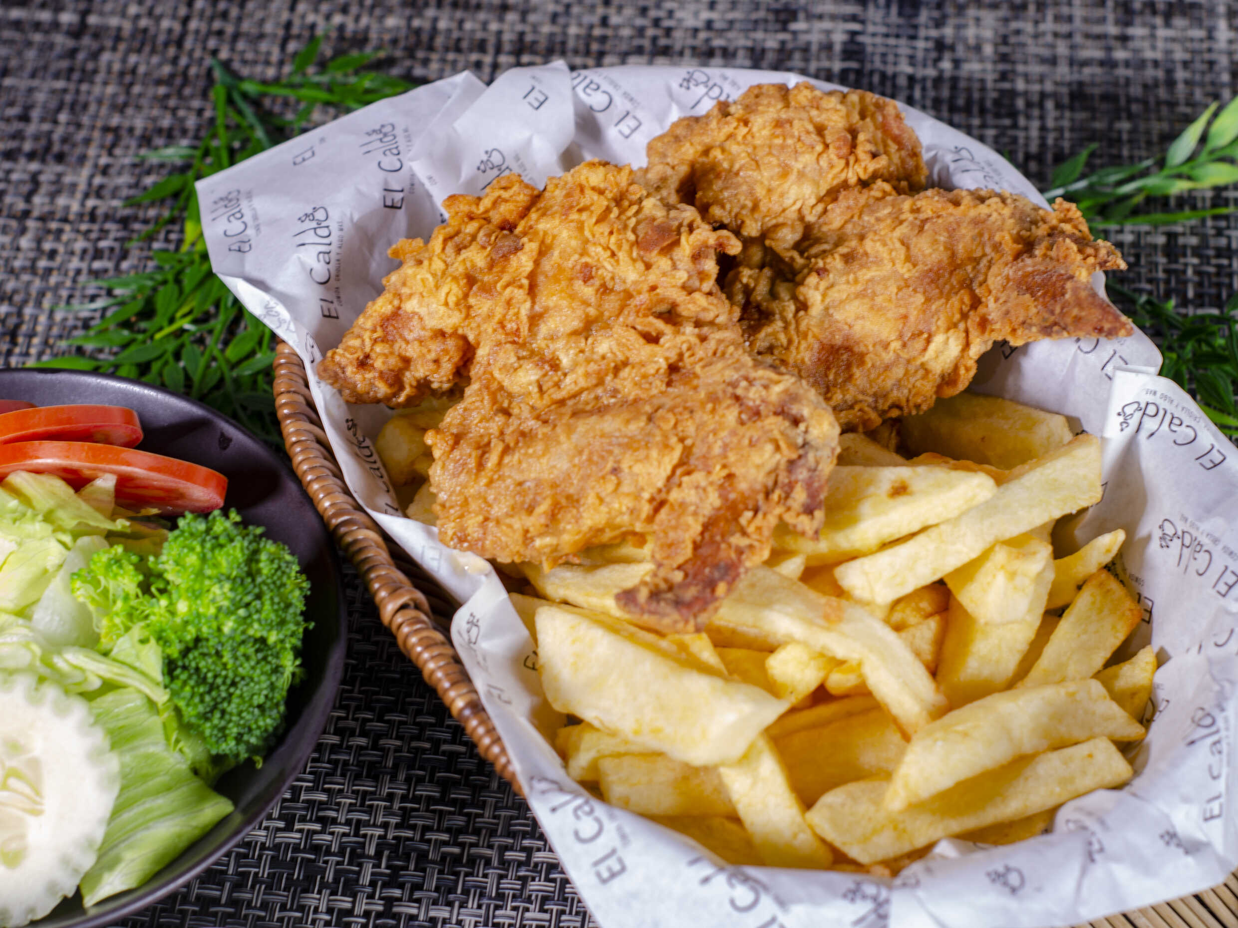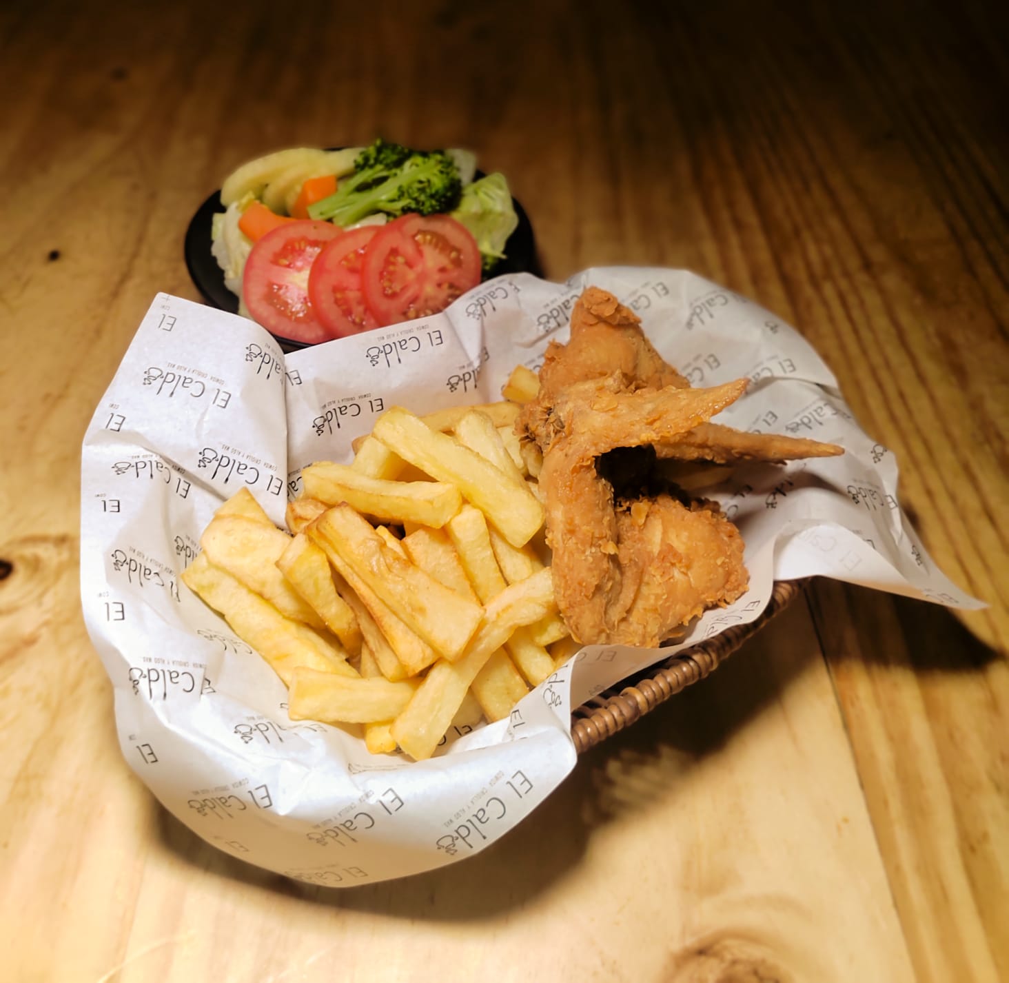 2 ALITAS BROASTER CROCANTES ACOMPAÑADAS DE PAPAFRITA Y ENSALADA