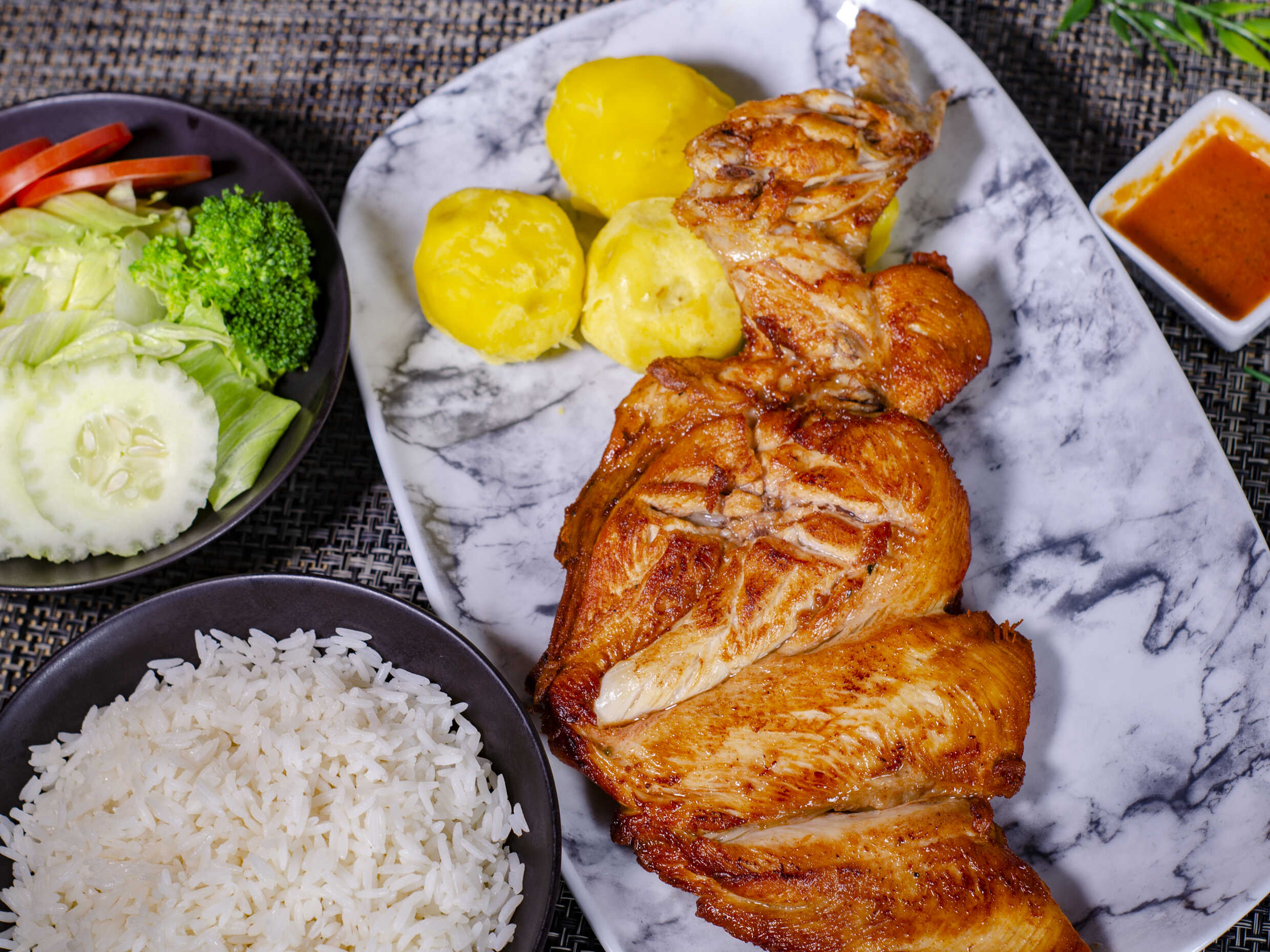 1/4 de pollada con papas fritas o papas sancochadas, ensalada y arroz.