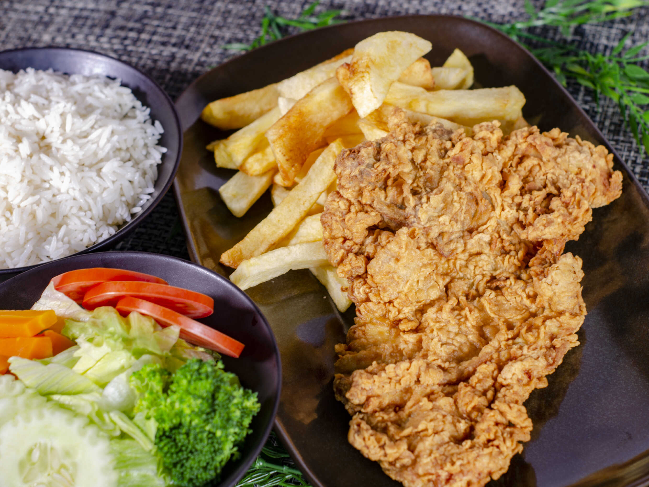 Con papas fritas, arroz y ensalada (lechuga, tomate y zanahoria).