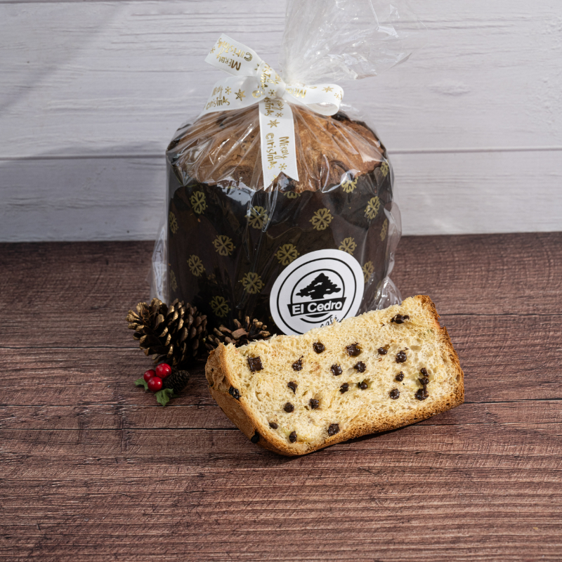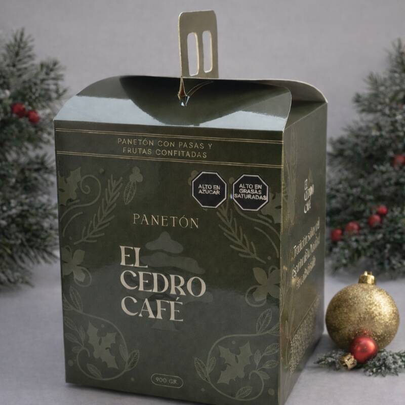 Panetón artesanal de pasas y frutas en su caja El Cedro.
