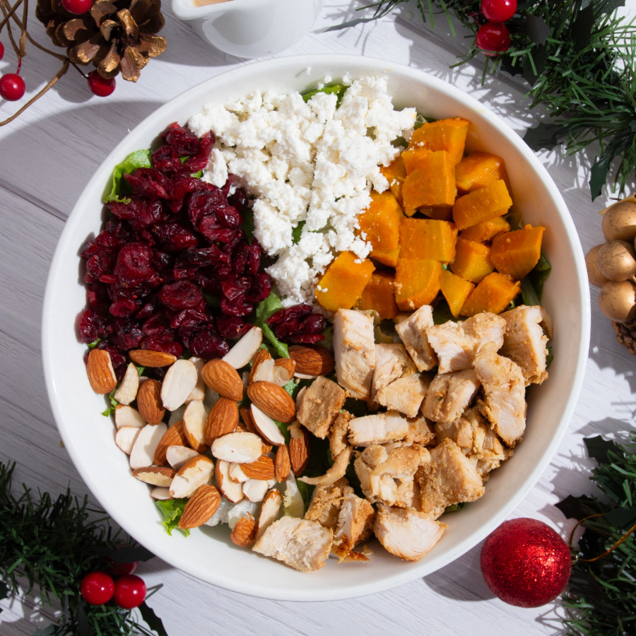 Ensalada con mix de espinaca y arúgula, palta, queso ricotta, cranberries, manzana, pecanas acarameladas, pavo (aliño balsámico).