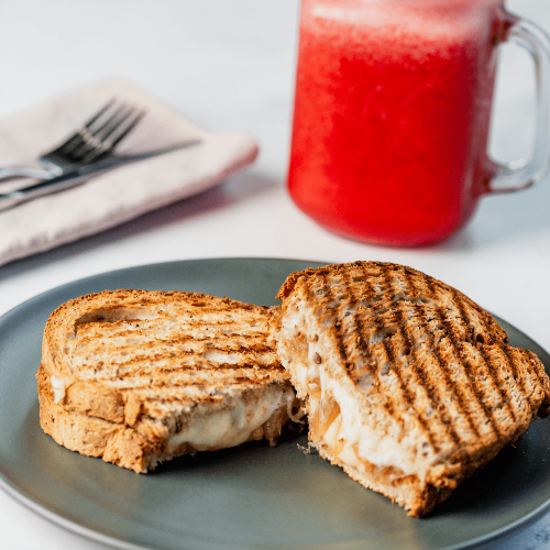 Sándwich caliente de pan pita con salsa pesto, queso mozzarella, tomate y albahaca
