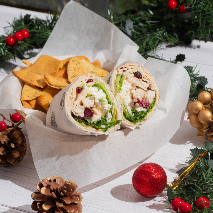 Enrollado de pan árabe, mix de lechugas, queso parmesano, croutones, pollo, aliño caesar y acompañamiento a elección.