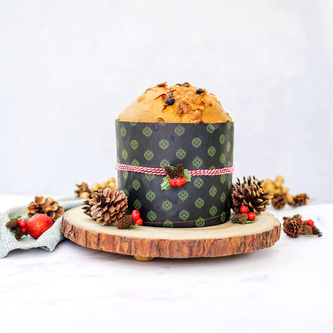 Panetón artesanal con chocolate, envuelto en su bolsa. listo para regalar en navidad