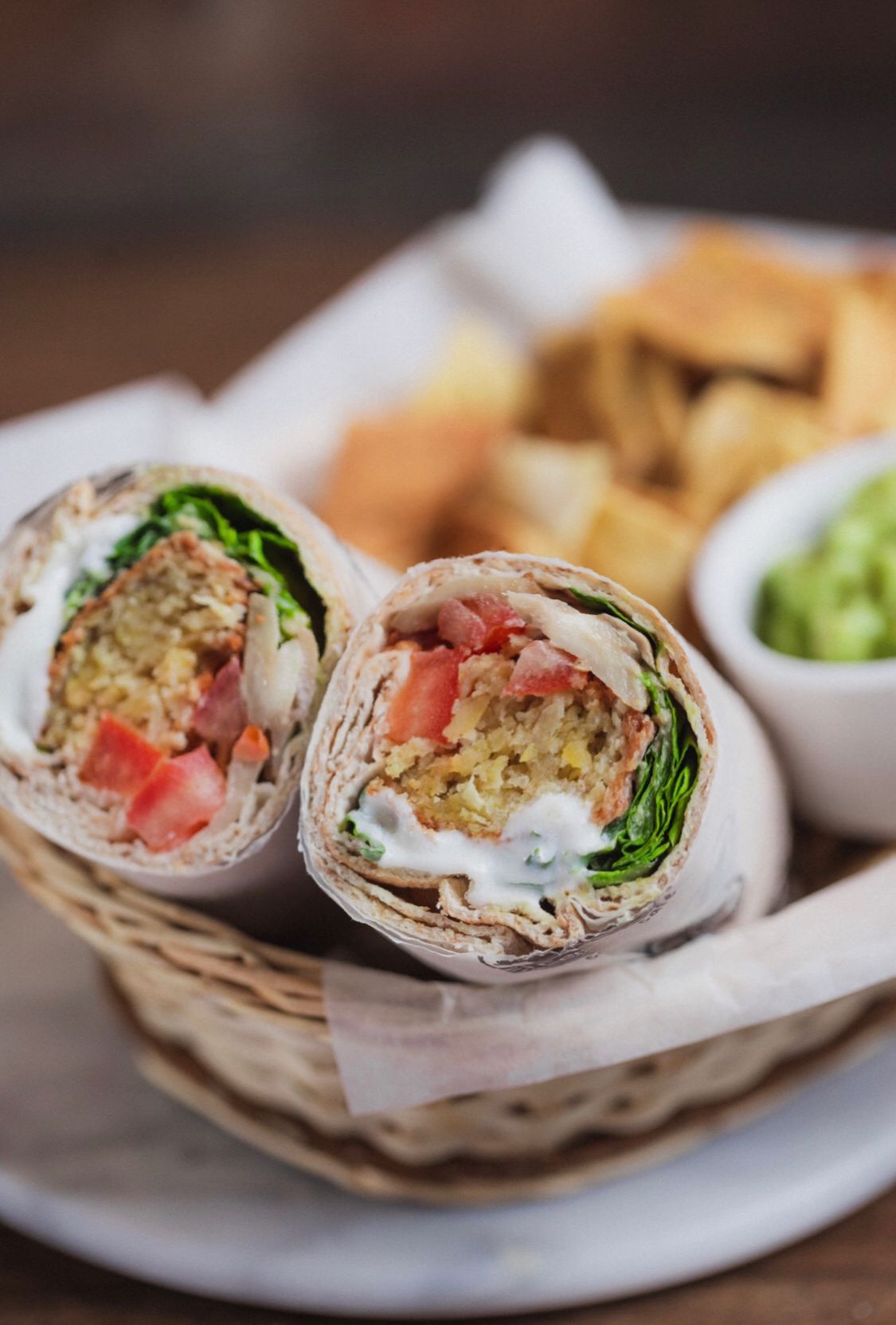 Enrollado de pan árabe con mix de espinaca y arúgula, champignones, tomate, hummus, falafel, aliño de yogurt y acompañamiento a elección