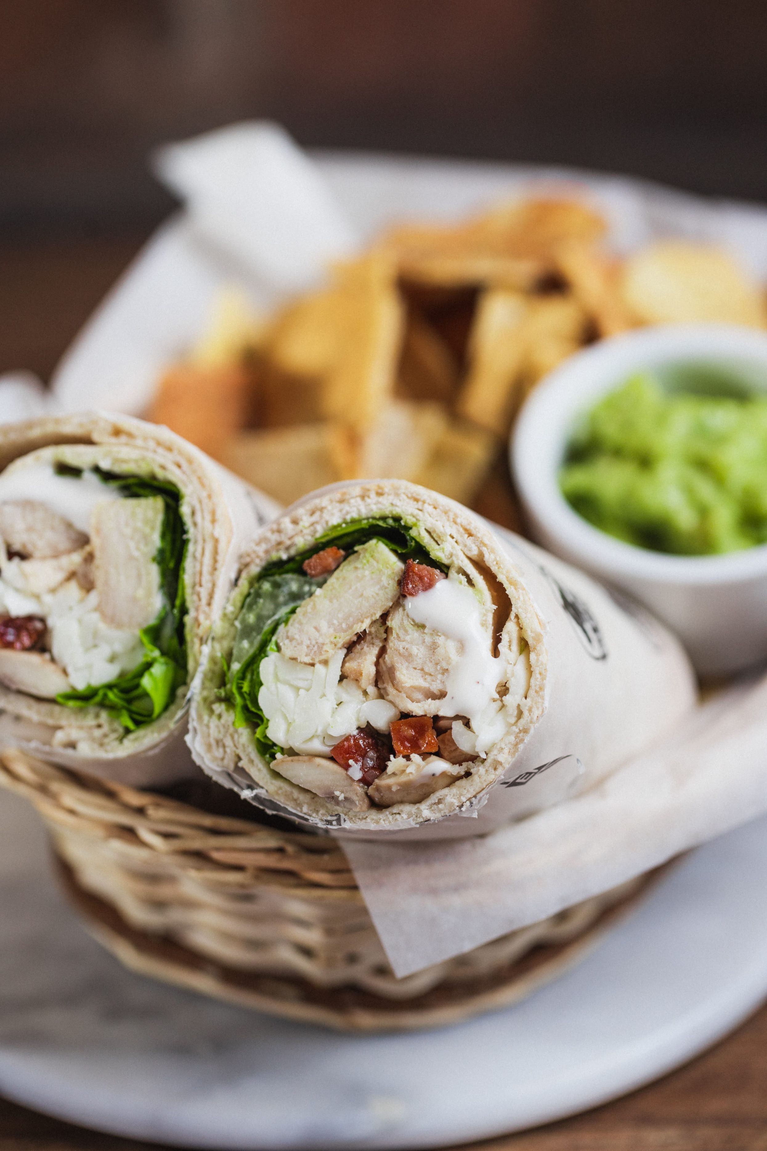 Enrollado de pan árabe, mix de lechugas, queso parmesano, croutones, pollo, aliño caesar y acompañamiento a elección.