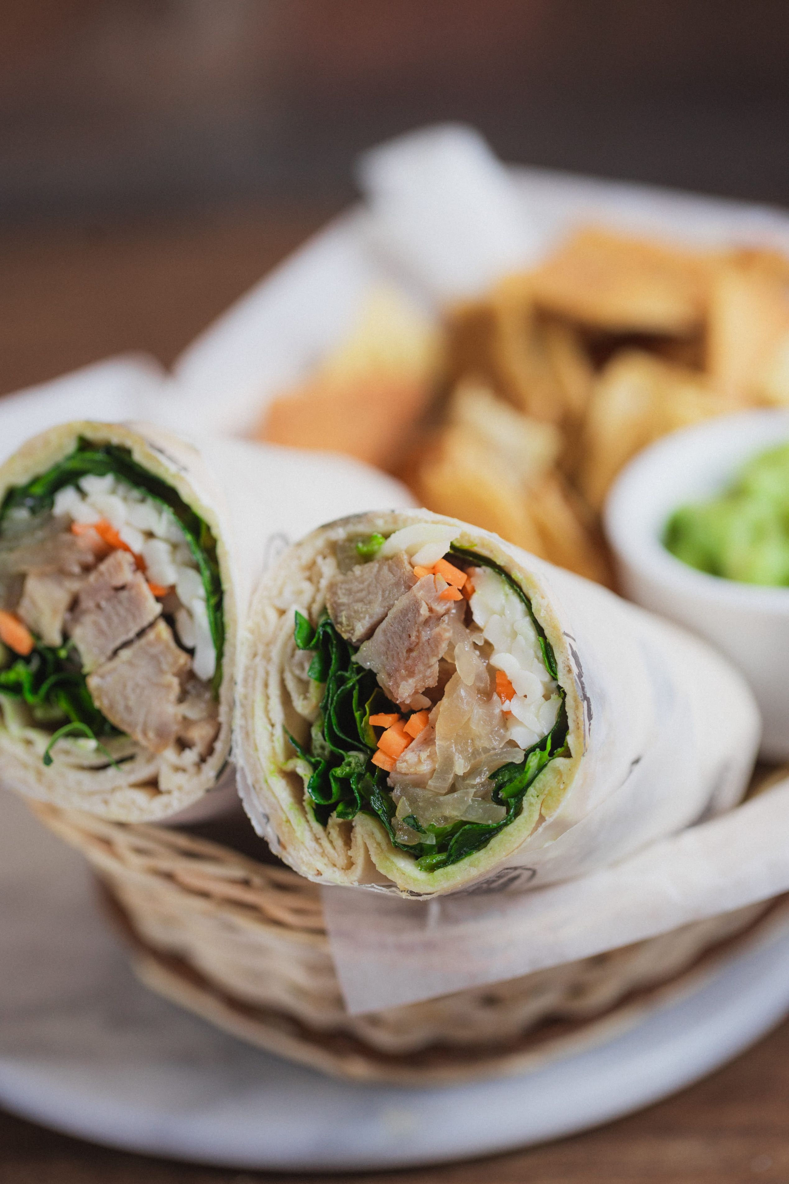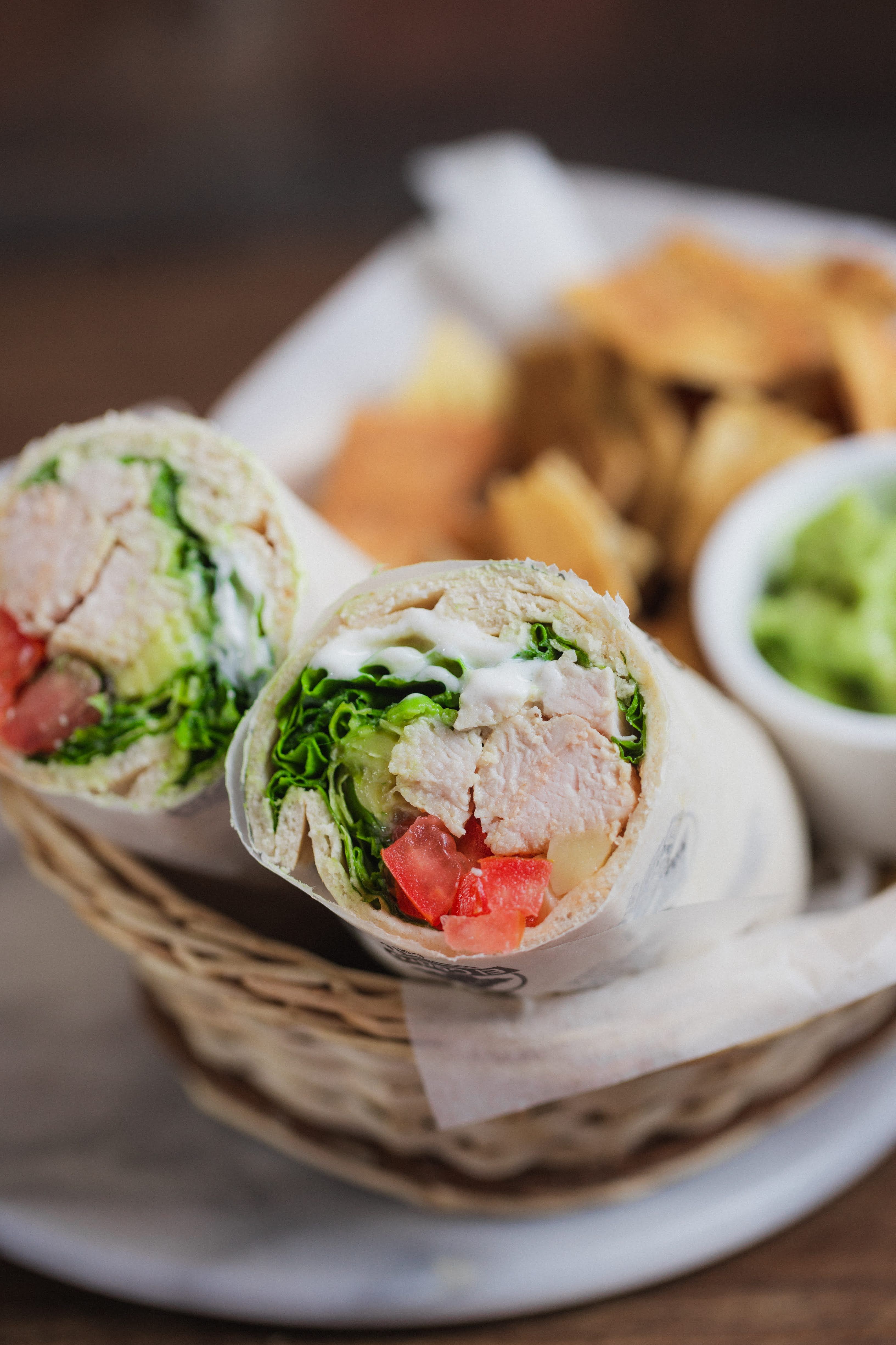 Enrollado de pan árabe, mix de espinaca y arúgula, palta, queso mozzarella, hummus, pollo, salsa de enrollados y acompañamiento a elección