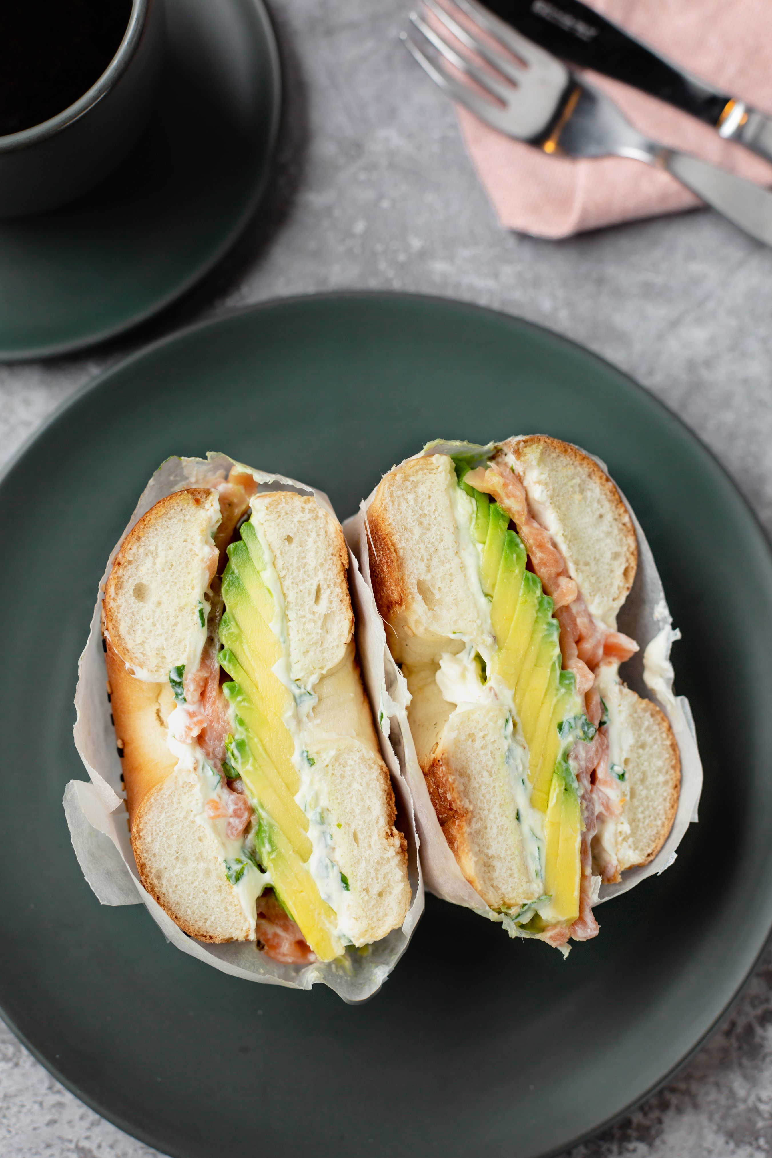 Sándwich de queso crema, palta, salmón, en pan bagel.