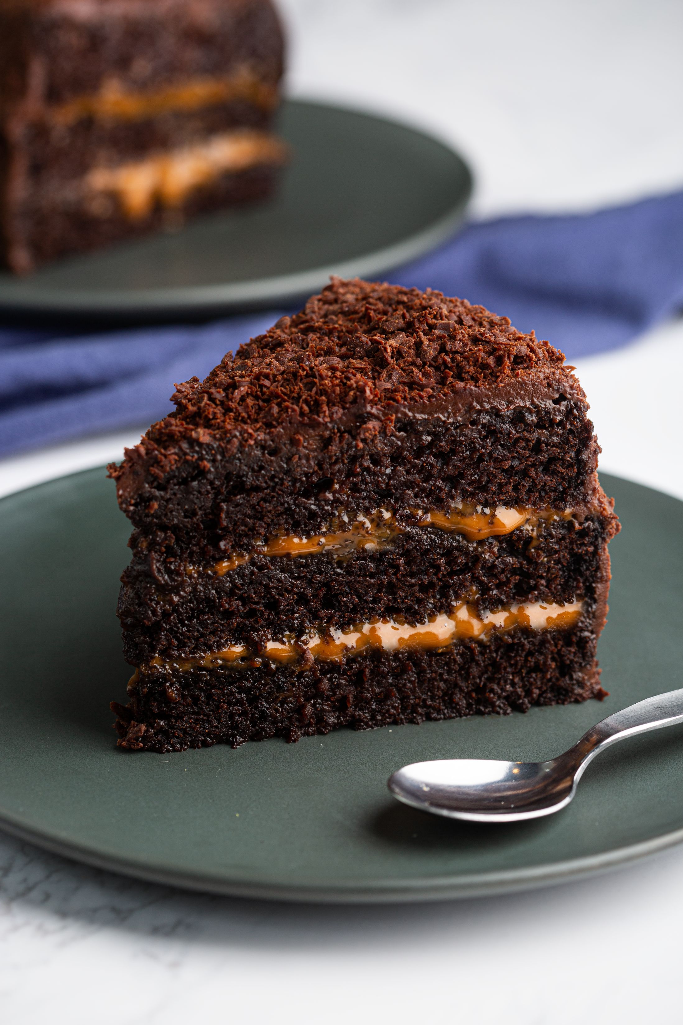 Torta de chocolate al 60% rellena con dos capas de manjar y bañada con fudge y chocolate rallado.
