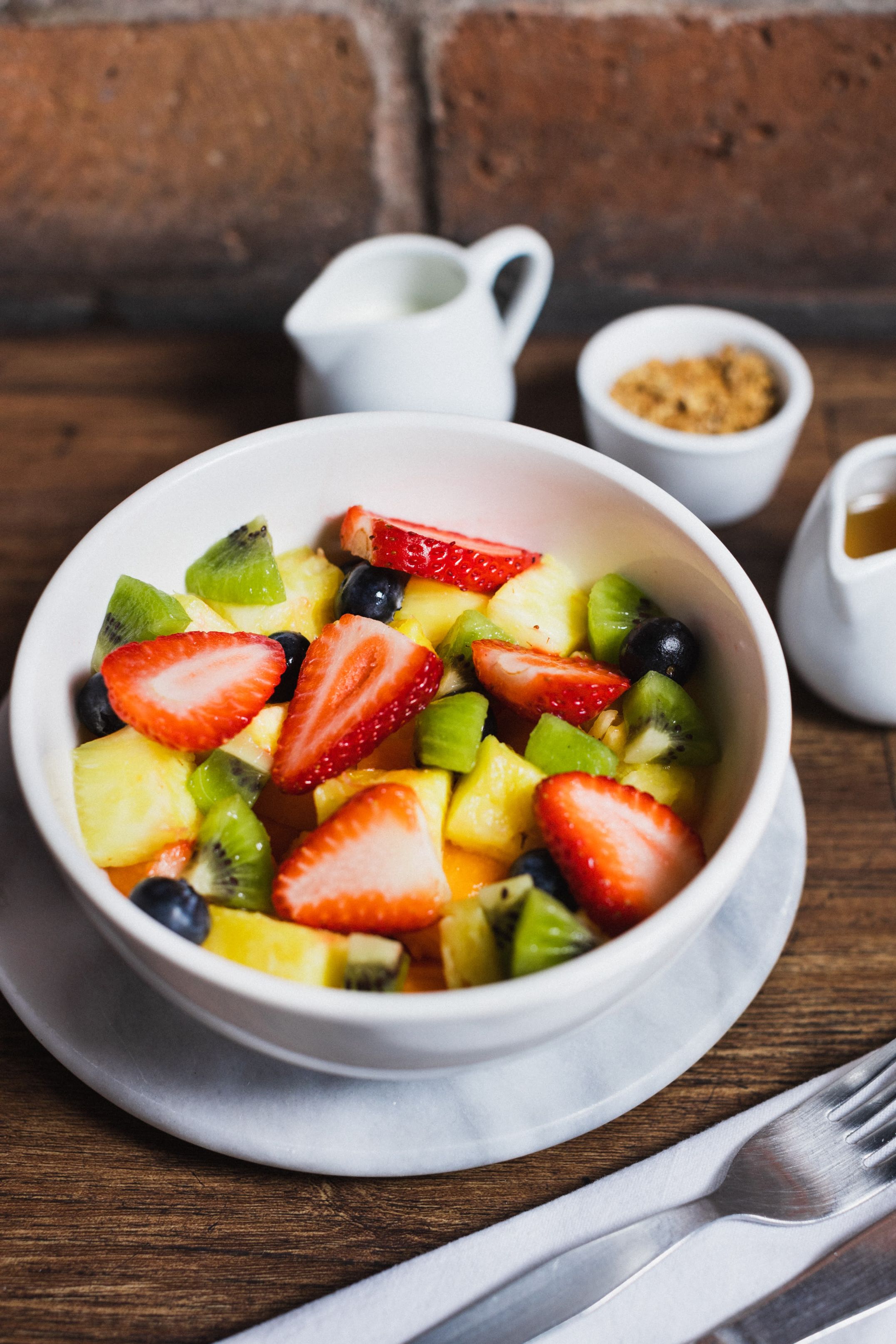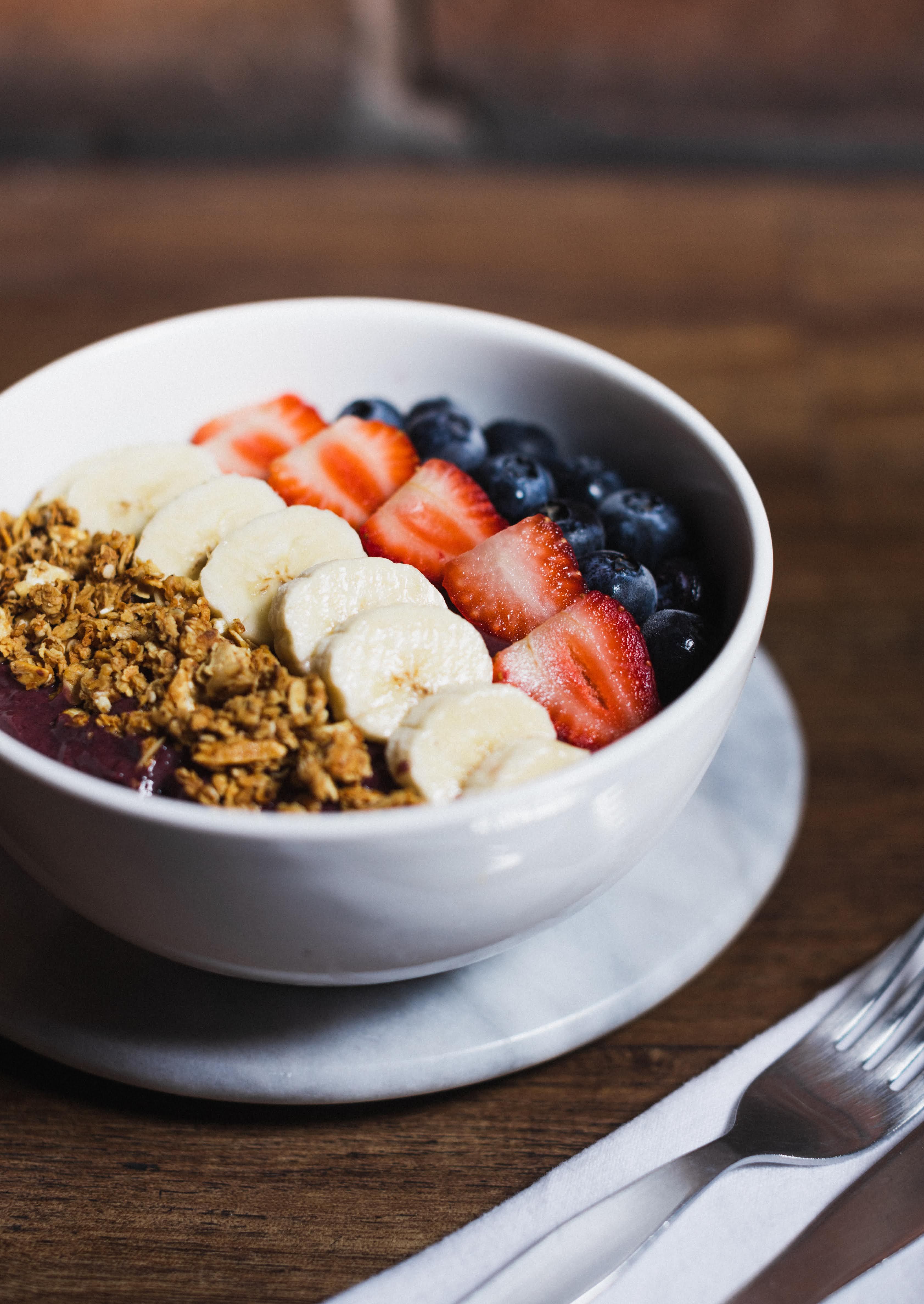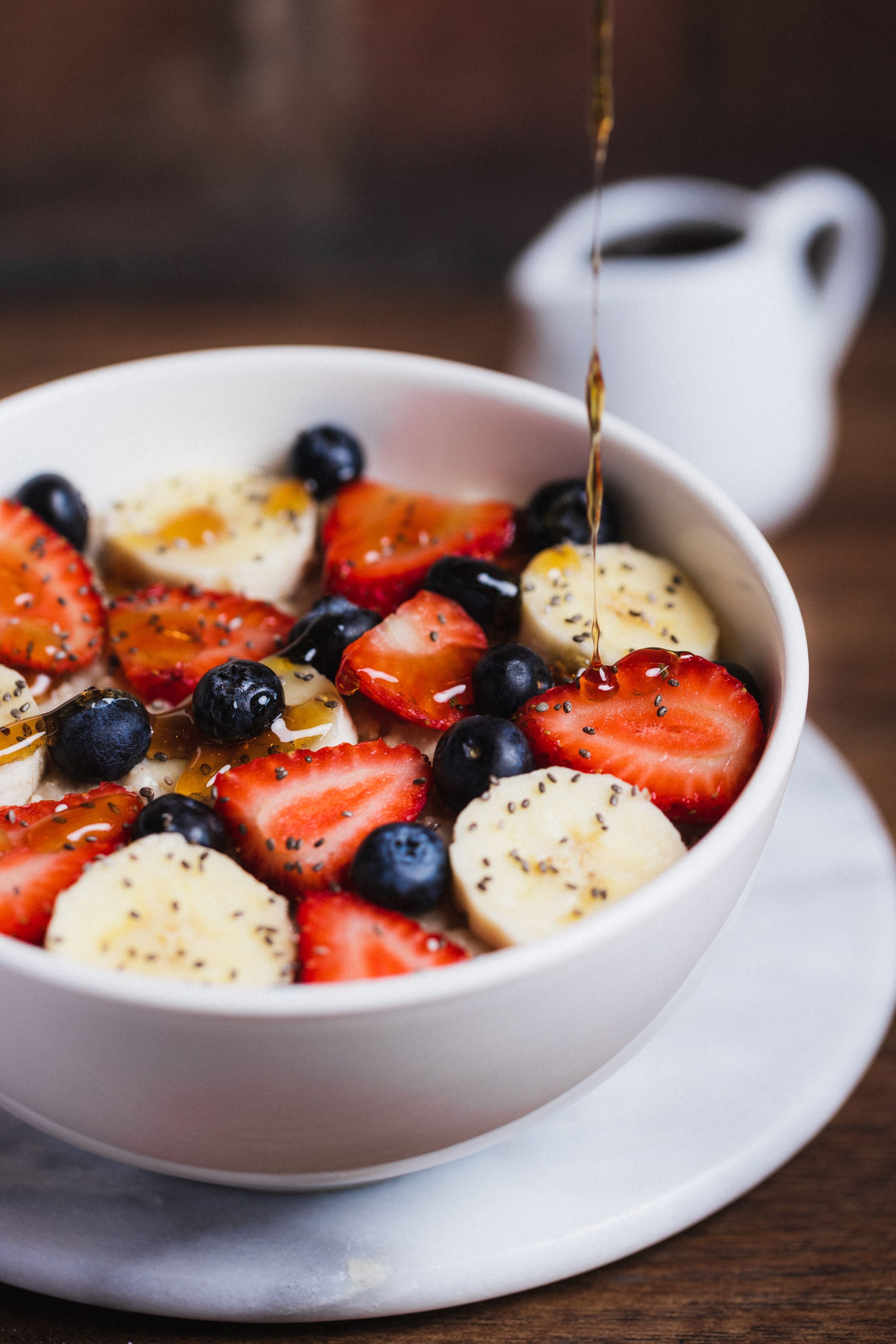 Bowl mediano a base de avena con toppings de plátano, fresas, blueberries, chía y miel.