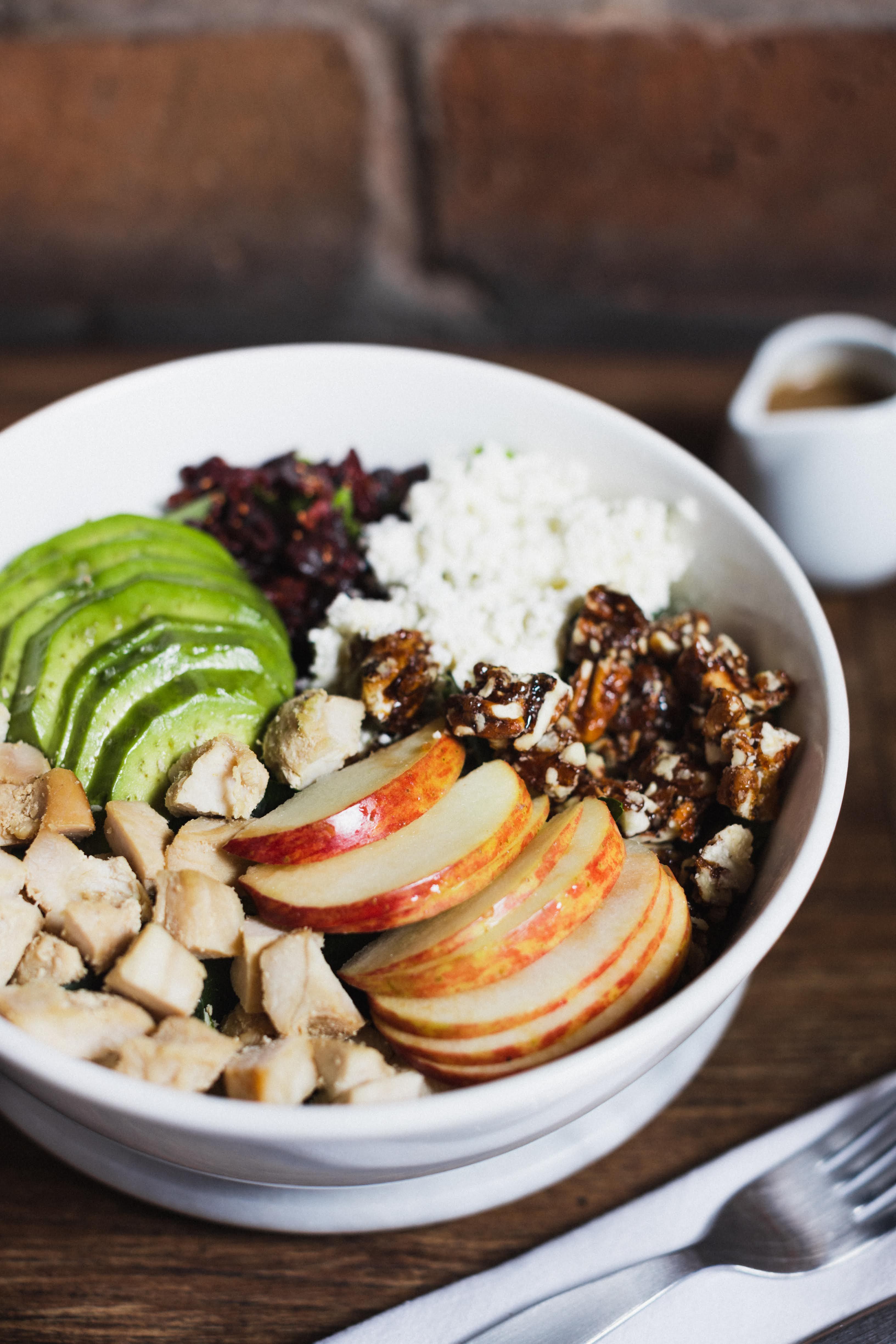 Mix de arúgula y espinaca, palta, queso ricotta, manzana, cranberries, pecanas acarameladas, pavo y aliño balsámico.