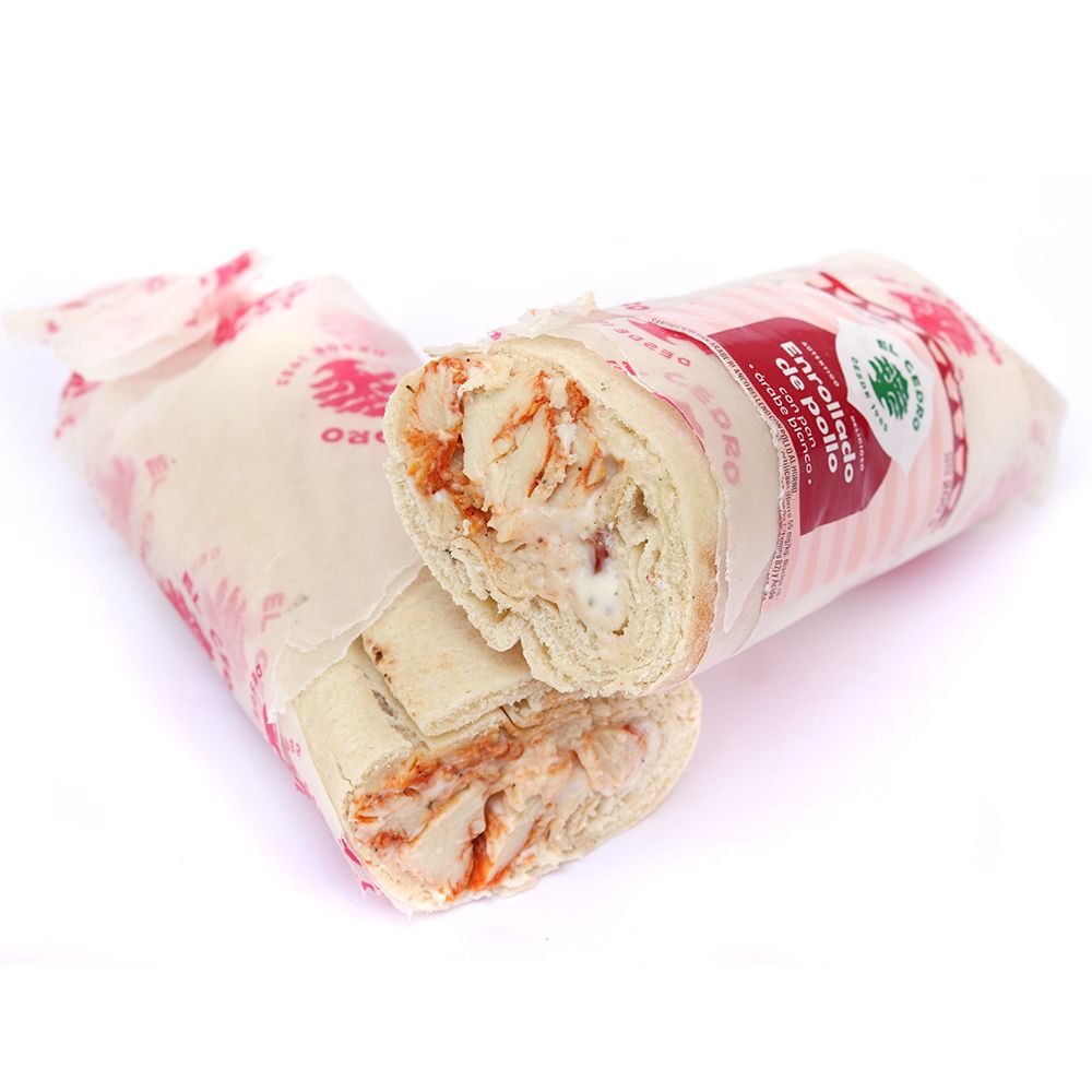 Enrollado de pan árabe con mix de lechugas, champiñones, queso mozzarella, tocino, pollo, salsa de enrollados y acompañamiento a elección.