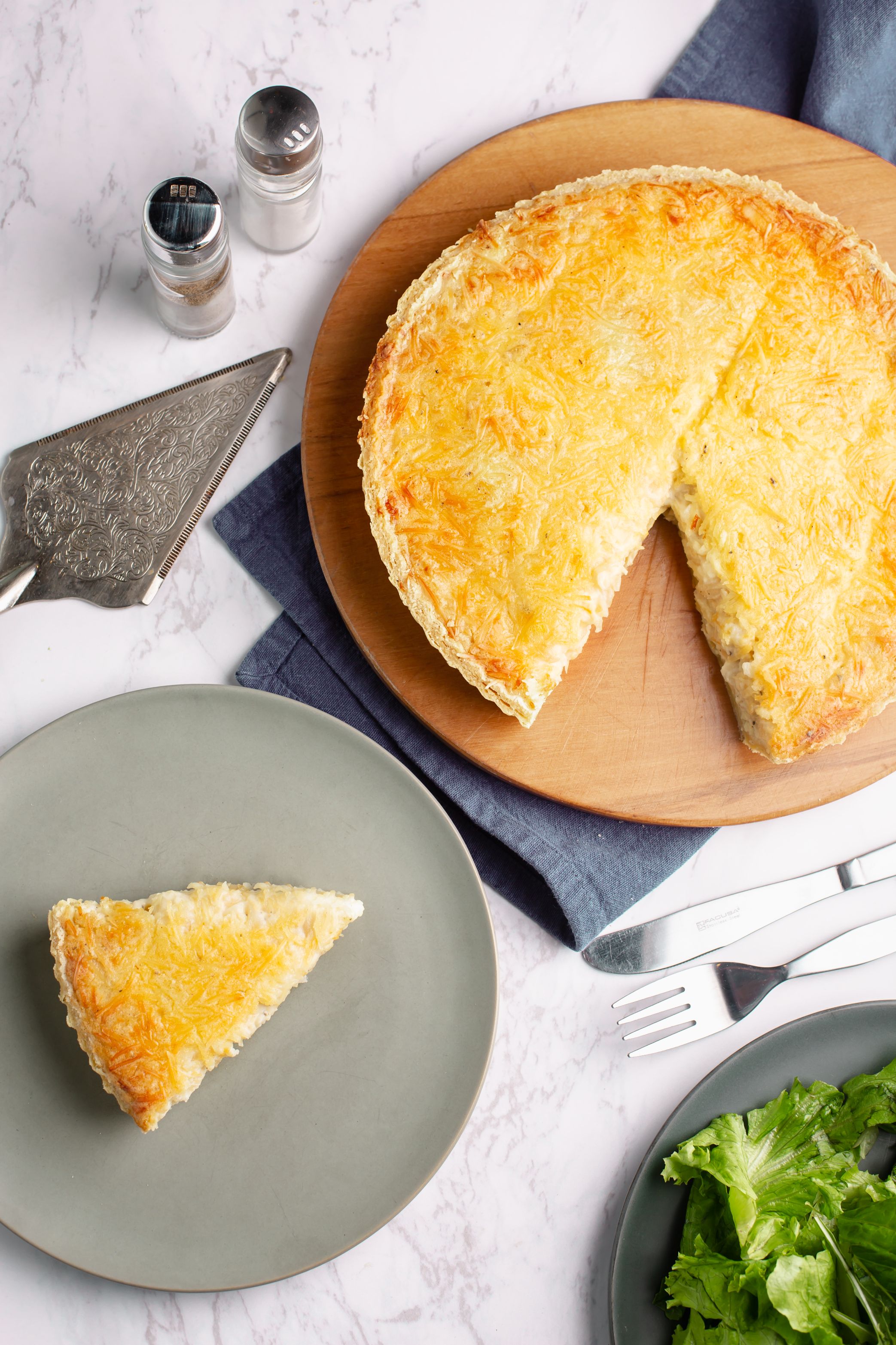 Porción de pastel de queso gratinado relleno de cebolla caramelizada y queso andino.