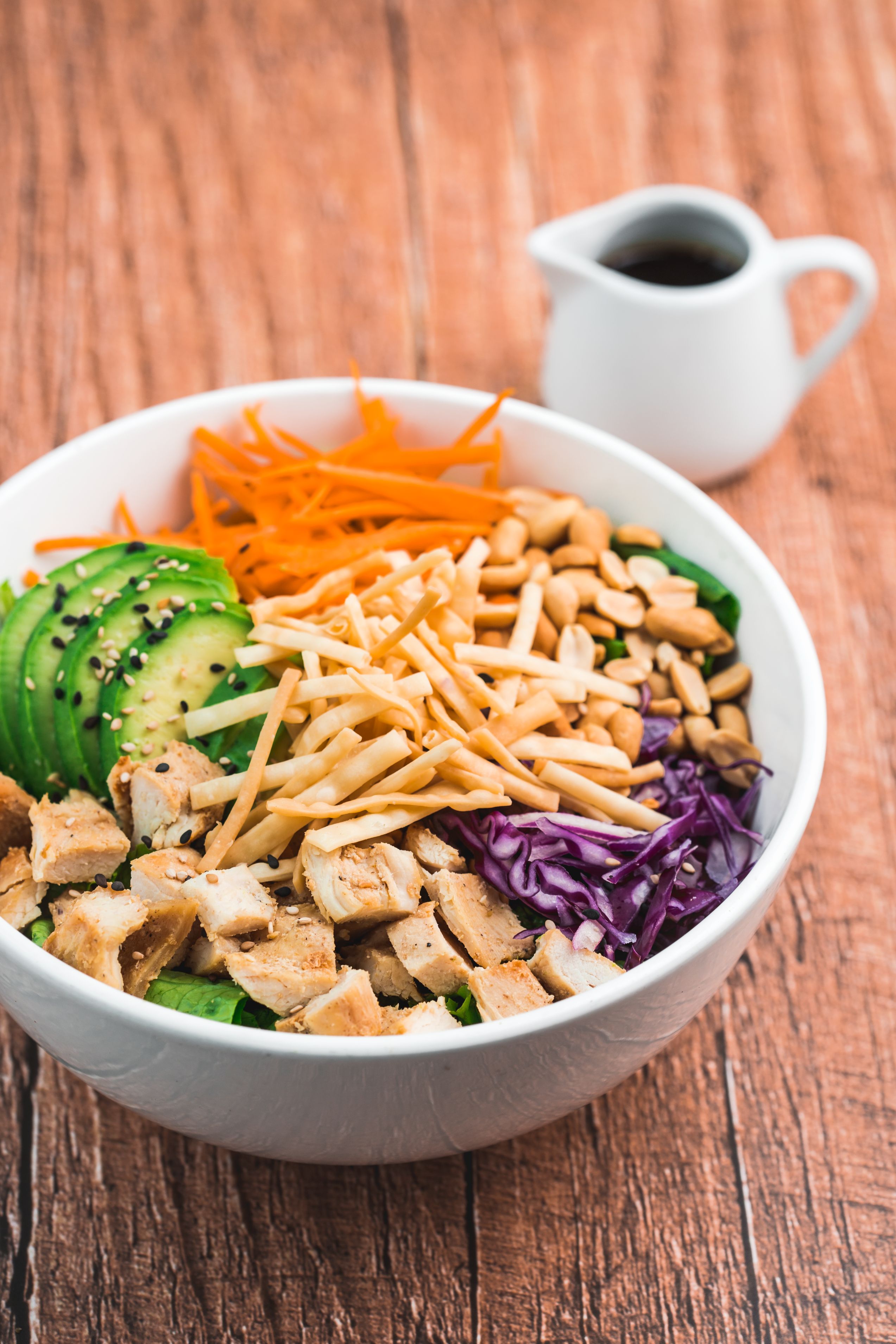 Ensalada con mix de lechugas, zanahoria, col morada, palta, maní, wantán, ajonjolí, pollo (salsa de anguila)