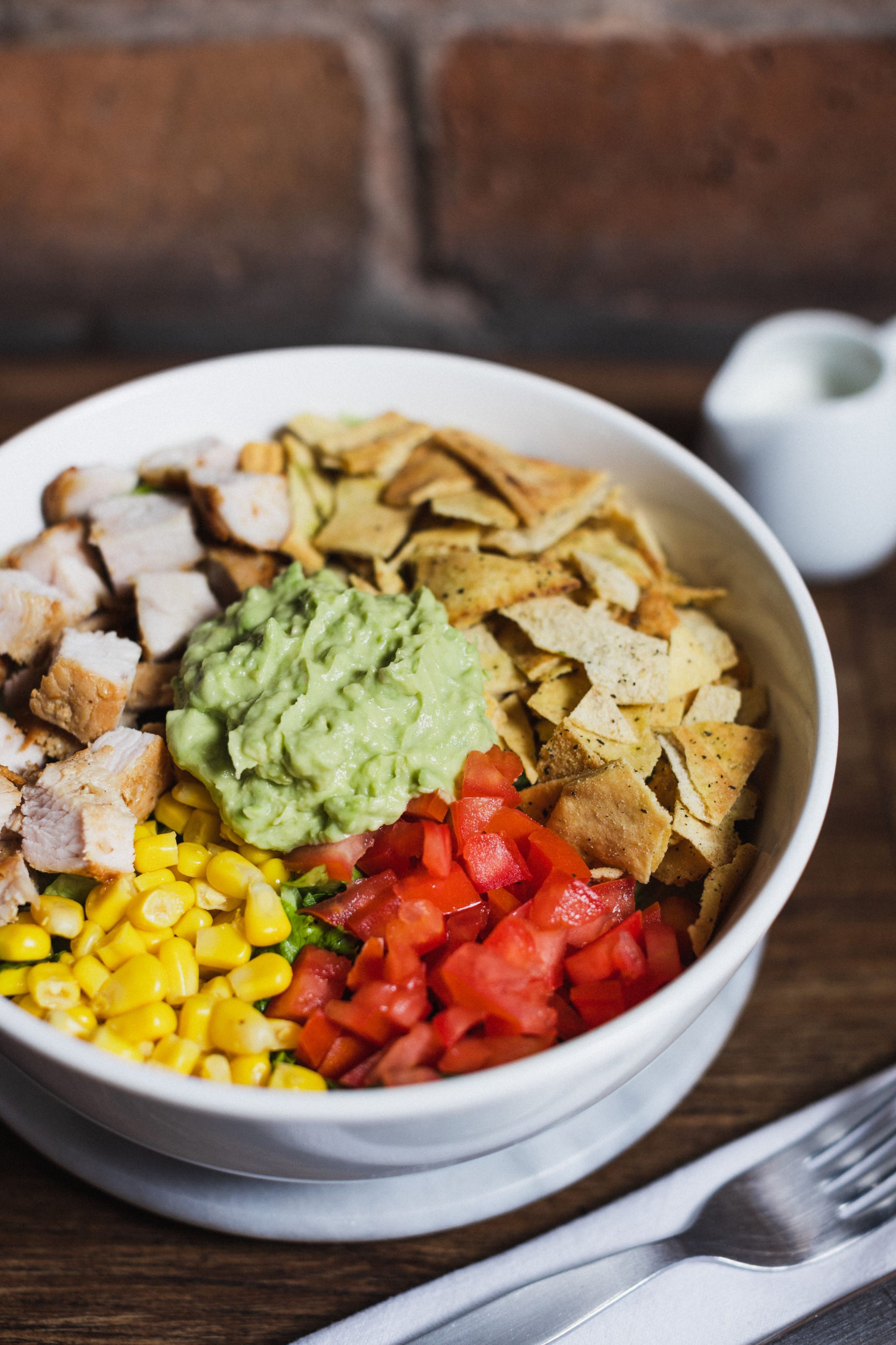 Mix de lechugas, tomate, choclo bebé, pita chips, guacamole, pavo y aliño de yogurt.