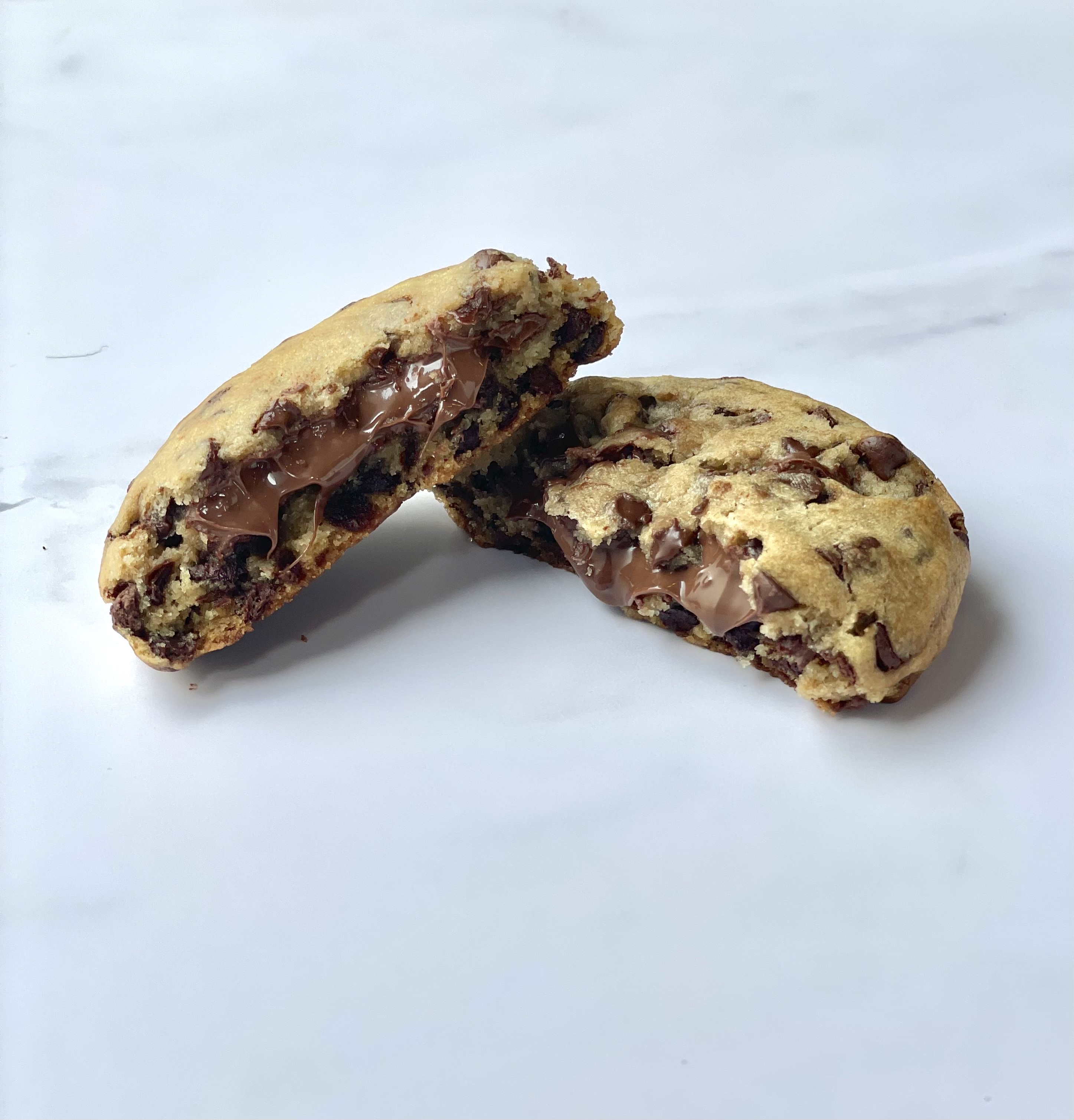 Barra de galleta con salsa de caramelo, nueces y chips de chocolate.