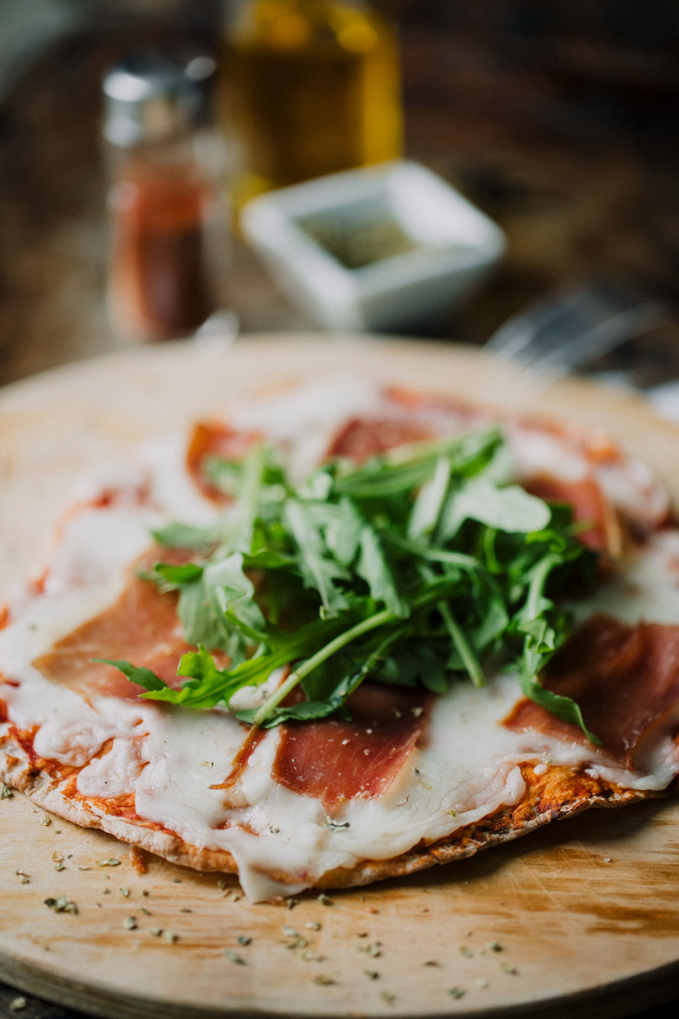 Pizzeta de prosciutto, arúgula, queso mozzarella, salsa de tomate