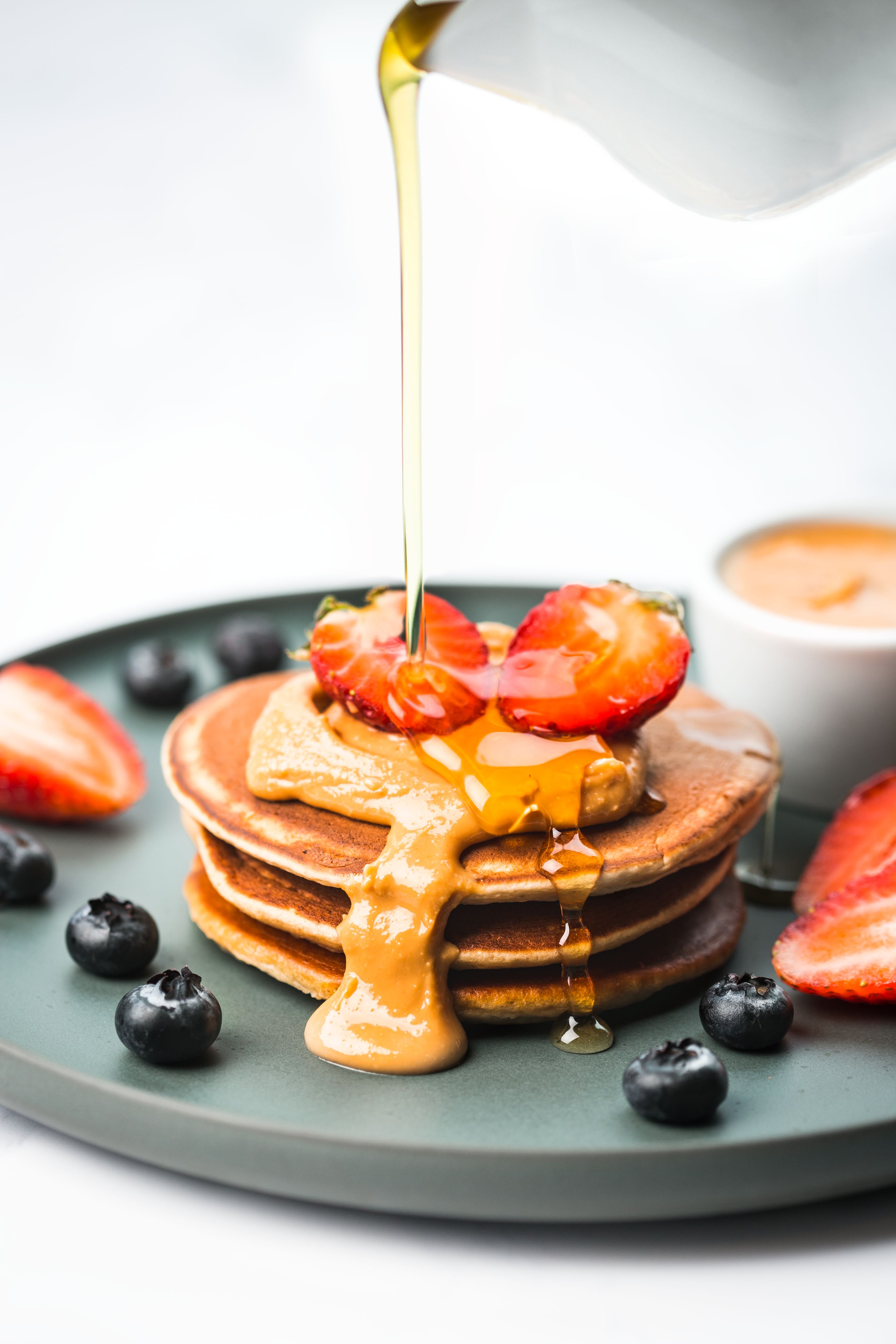 Tres panqueques de avena con toppings de frutos rojos, mantequilla de maní y miel de casa.