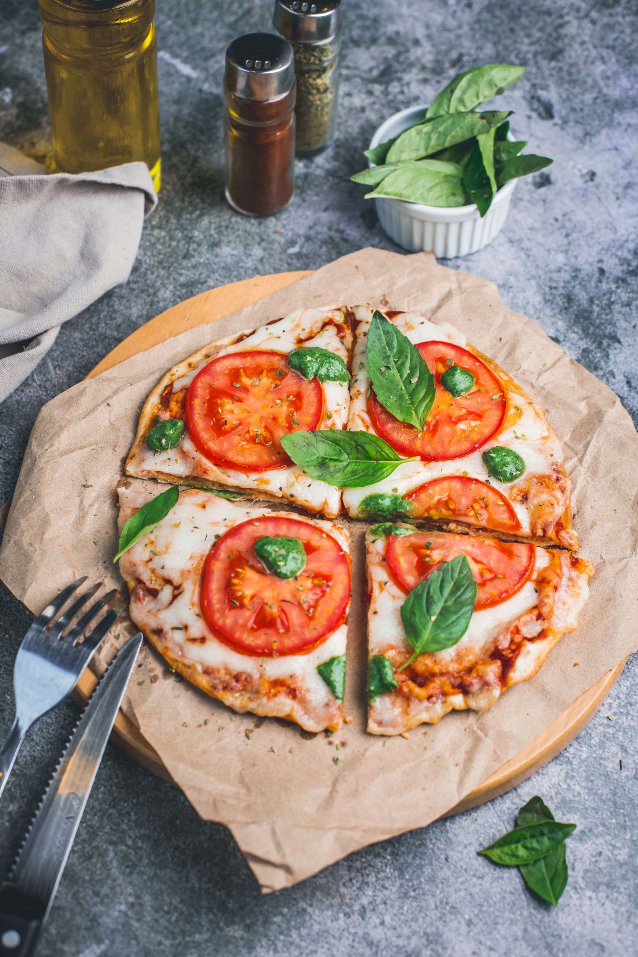 Pizzeta queso mozzarella, tomate, albahaca, pesto.