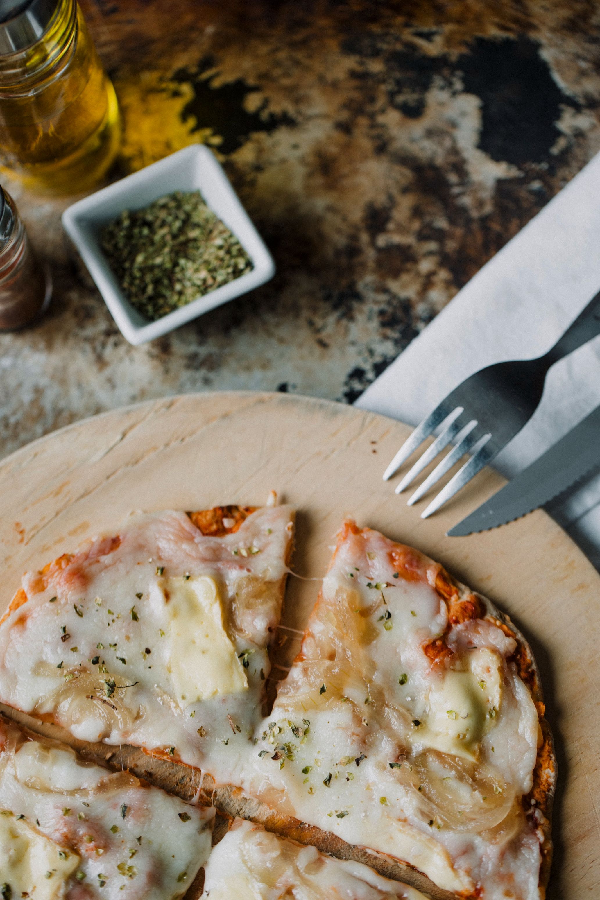 Pizzeta queso brie, cebolla caramelizada, queso mozzarella, salsa de tomate