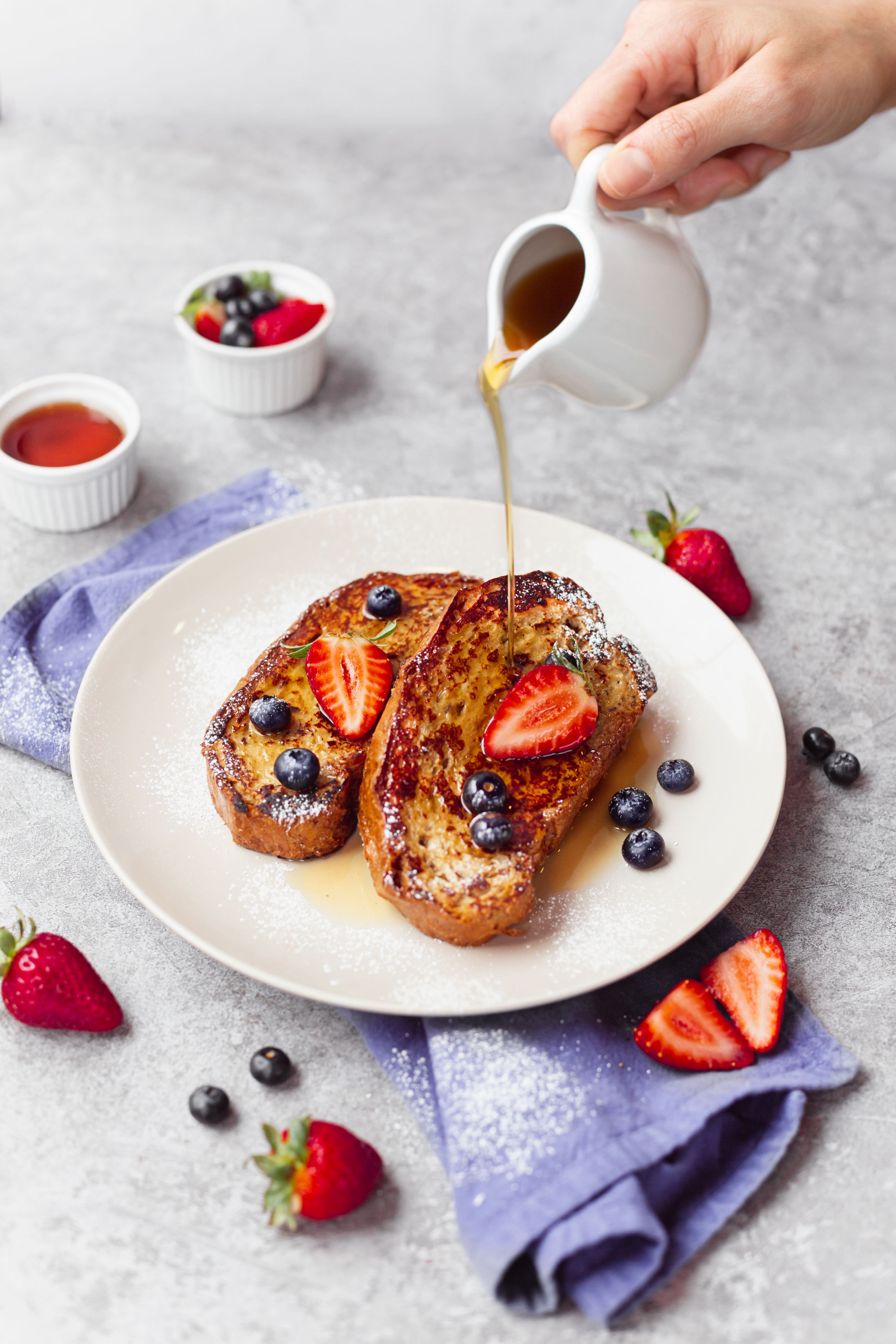 Dos tostadas francesas integrales con frutos rojos y miel de la casa.