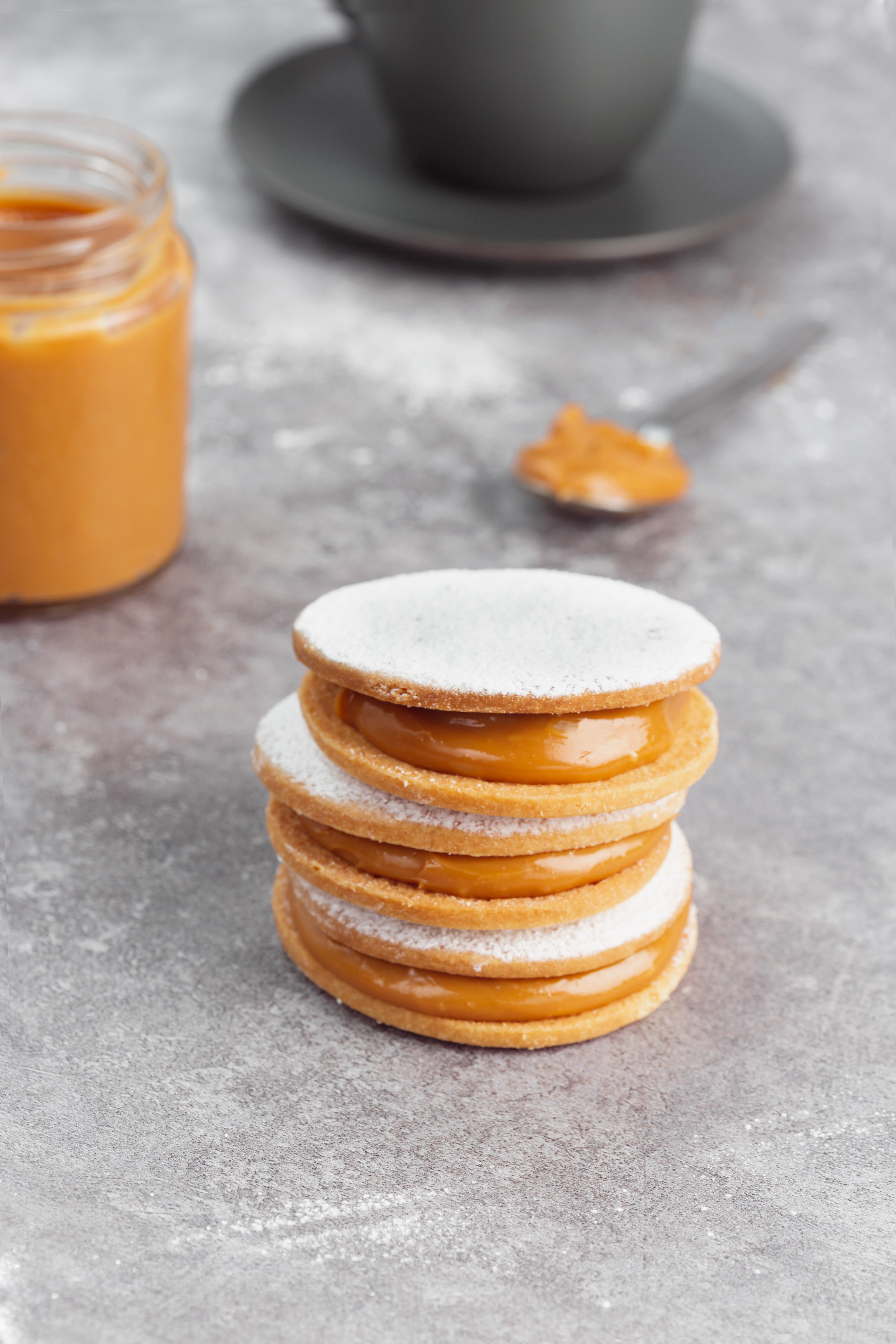 Galleta de alfajor rellena de manjar de olla y cubierta con azúcar en polvo. incluye una unidad.