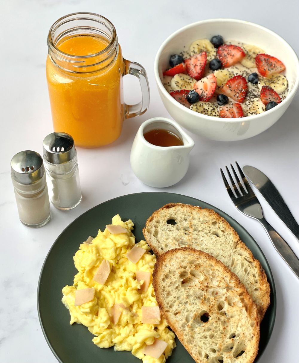 Bowl de avena, tostones con huevo revuelto y jugo a elección 400 ml.