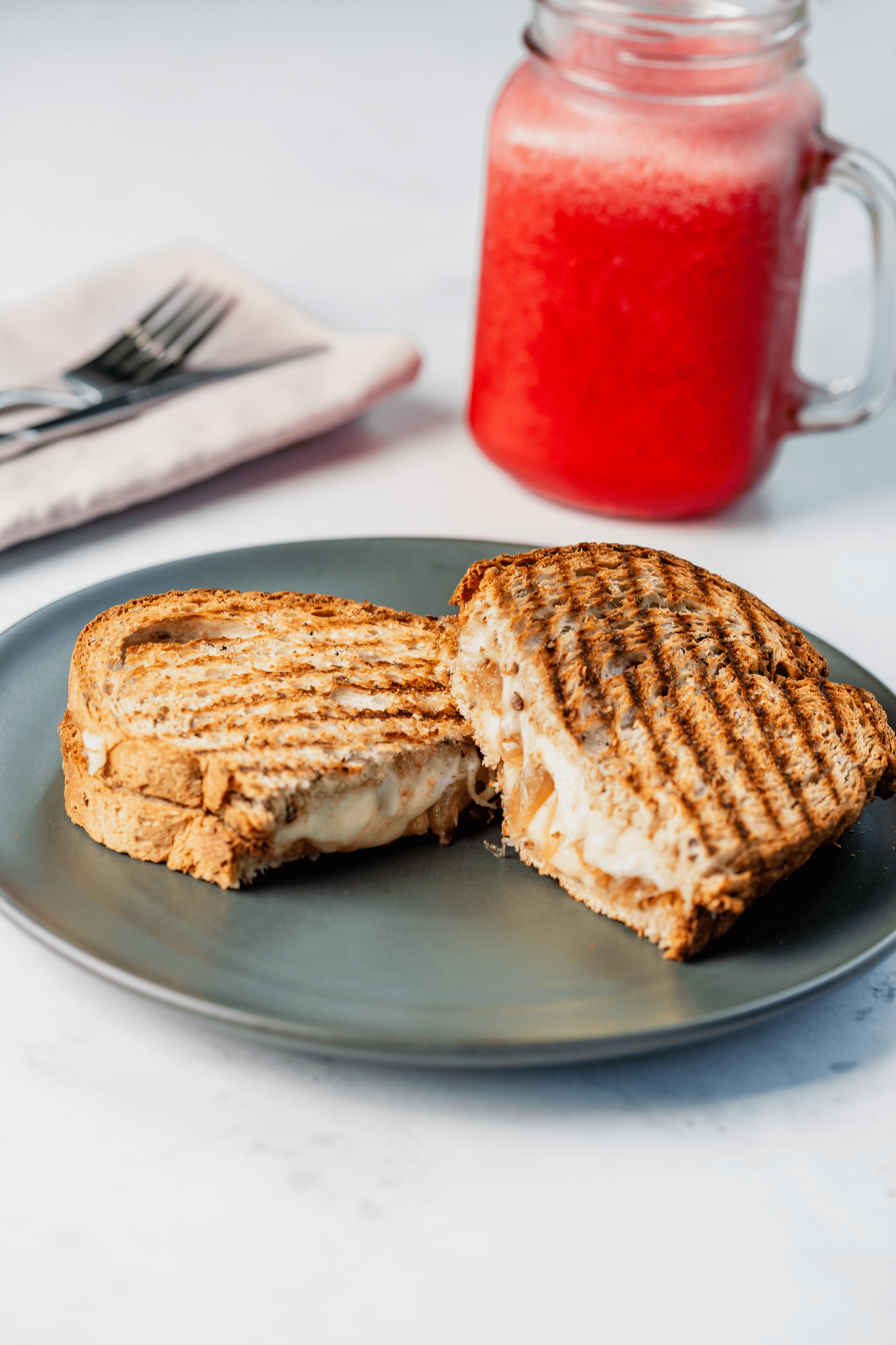 Sándwich en pan brioche con huevo revuelto, queso derretido y tocino.