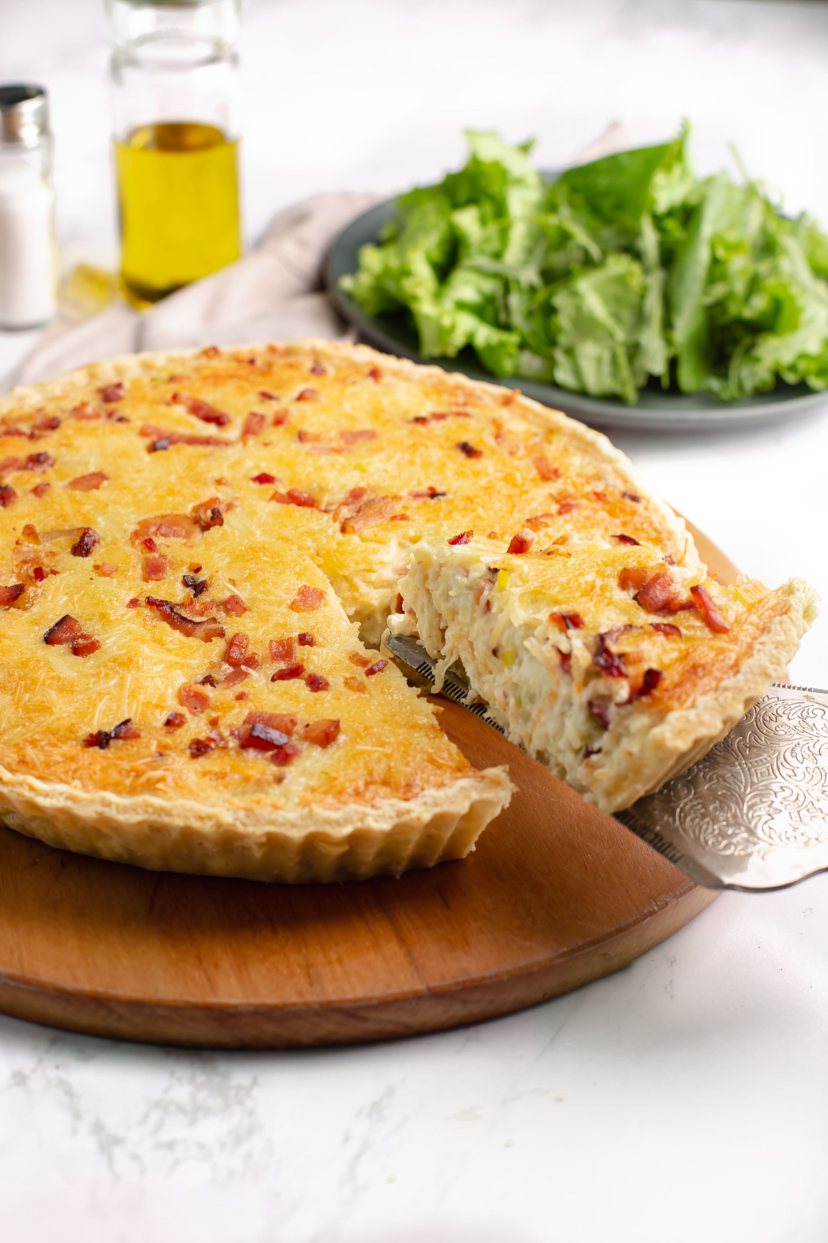 Porción de pastel de queso gratinado relleno de poro y tocino.