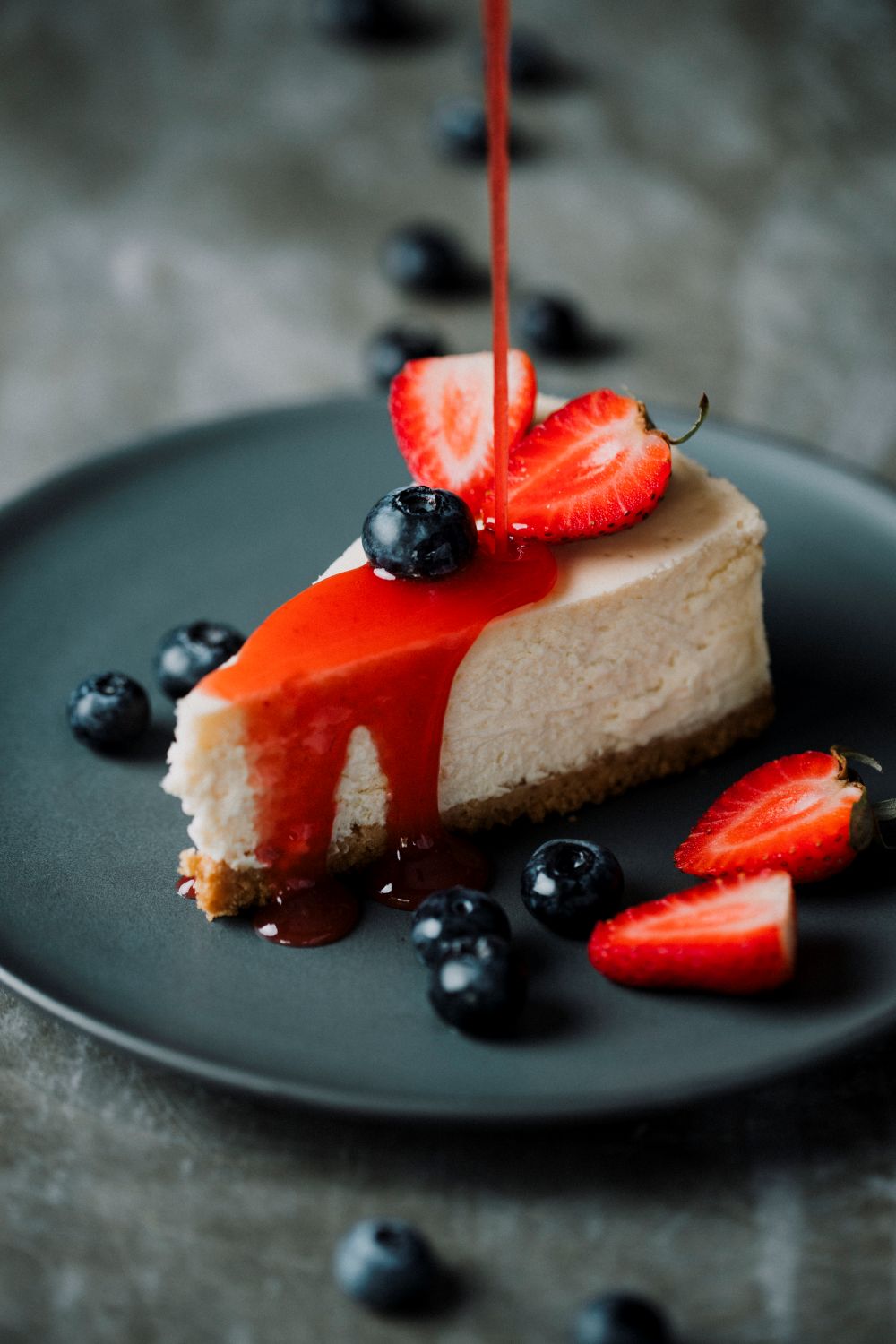 Postre de queso crema, con base de galleta y topping de frutos del bosque y salsa de fresas.