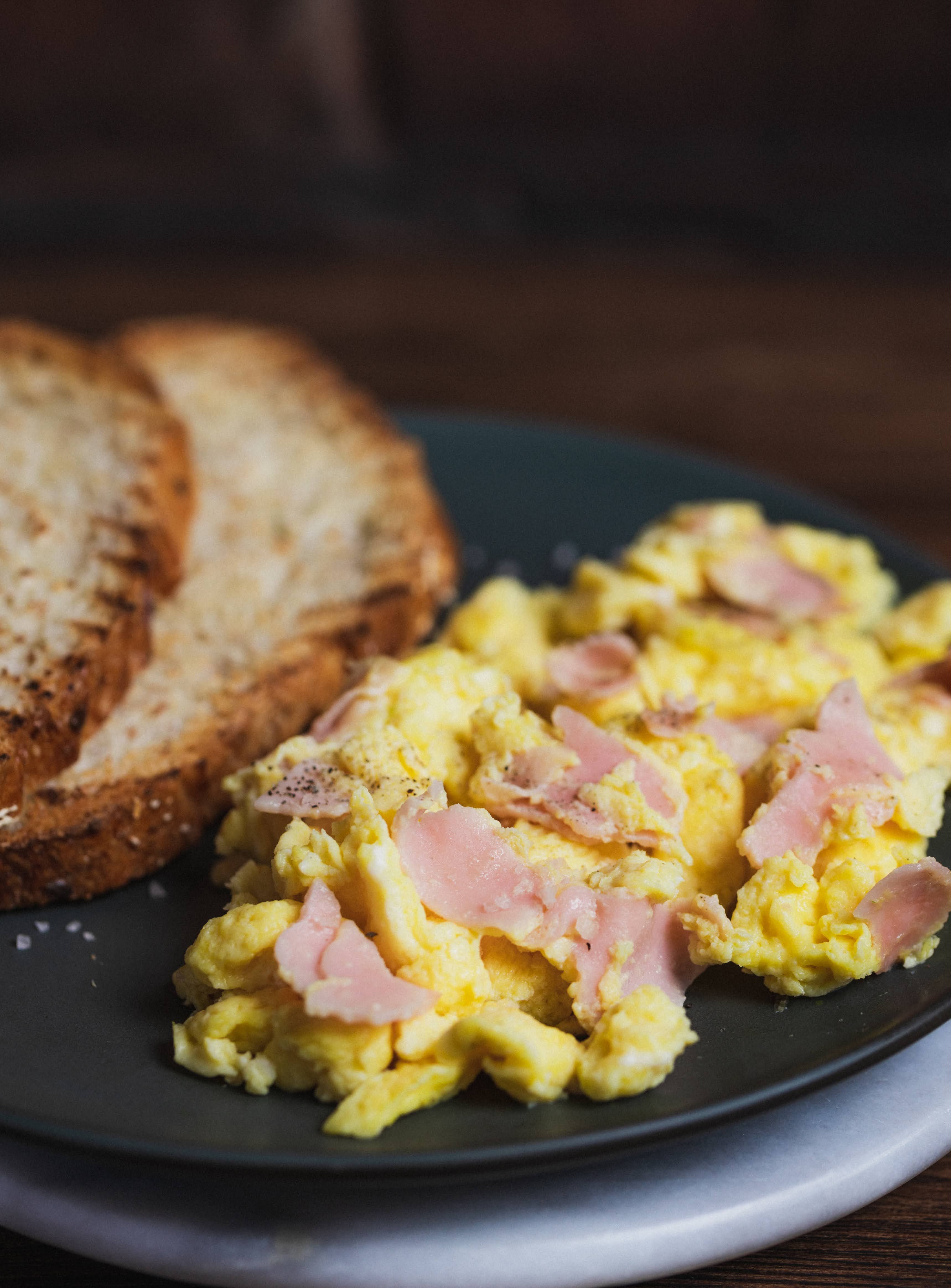 Dos tostones de pan de masa madre con huevo revuelto y jamón.
