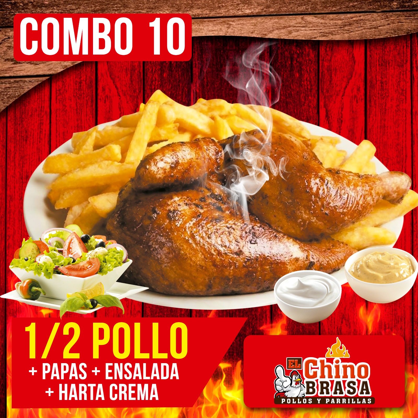 1/2 Pollo a la brasa, papas fritas, ensalada y hartas cremas.