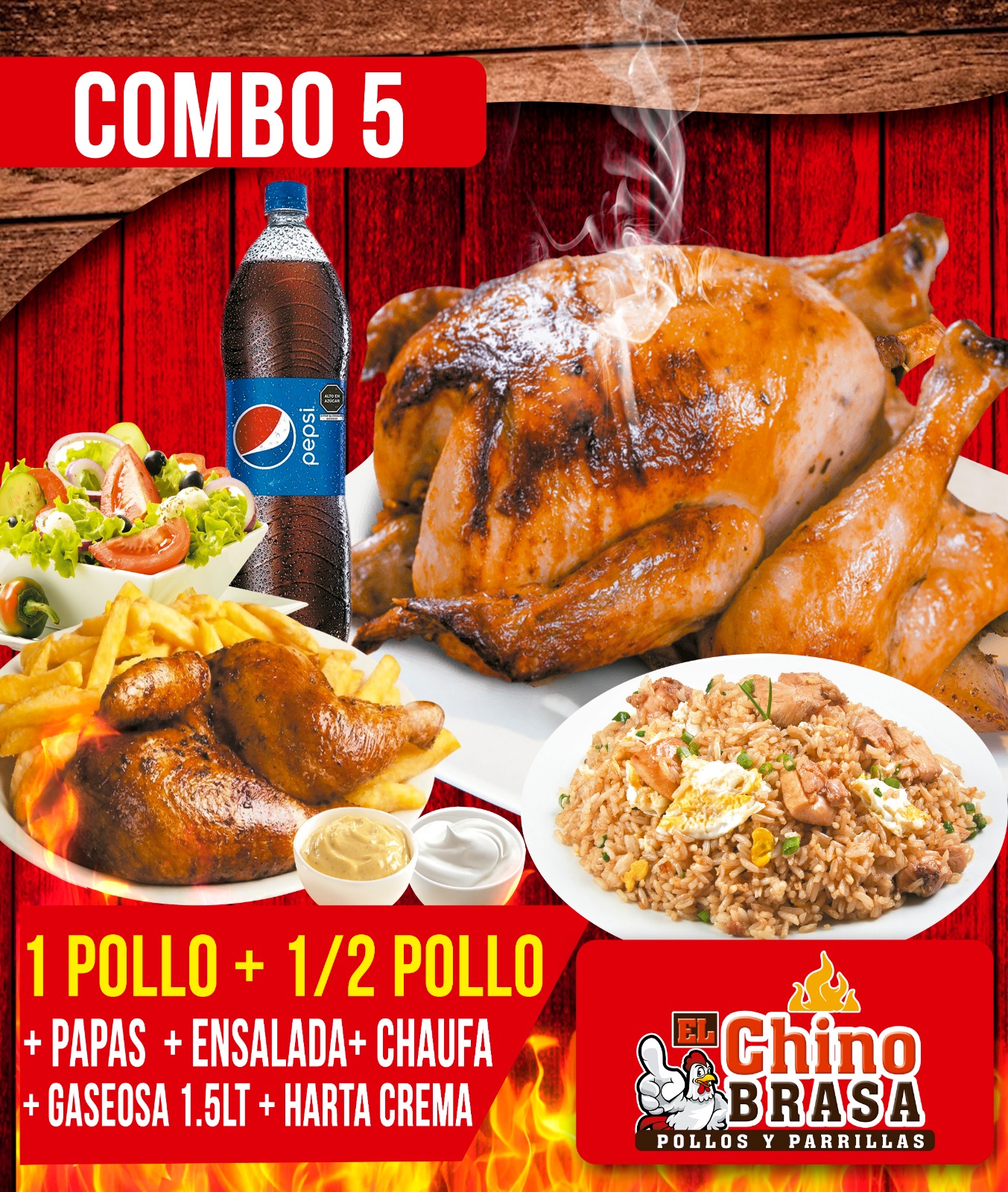 1 Pollo a la brasa, 1/2 pollo, chaufa, papas fritas, hartas cremas y Pepsi 1.5 L.