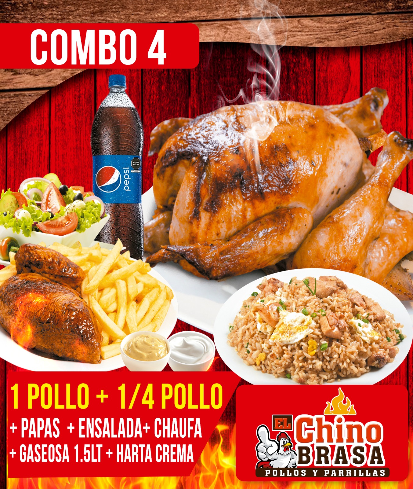1 Pollo a la brasa, 1/4 pollo, papas fritas, chaufa, ensalada, hartas cremas y Pepsi 1.5 L.