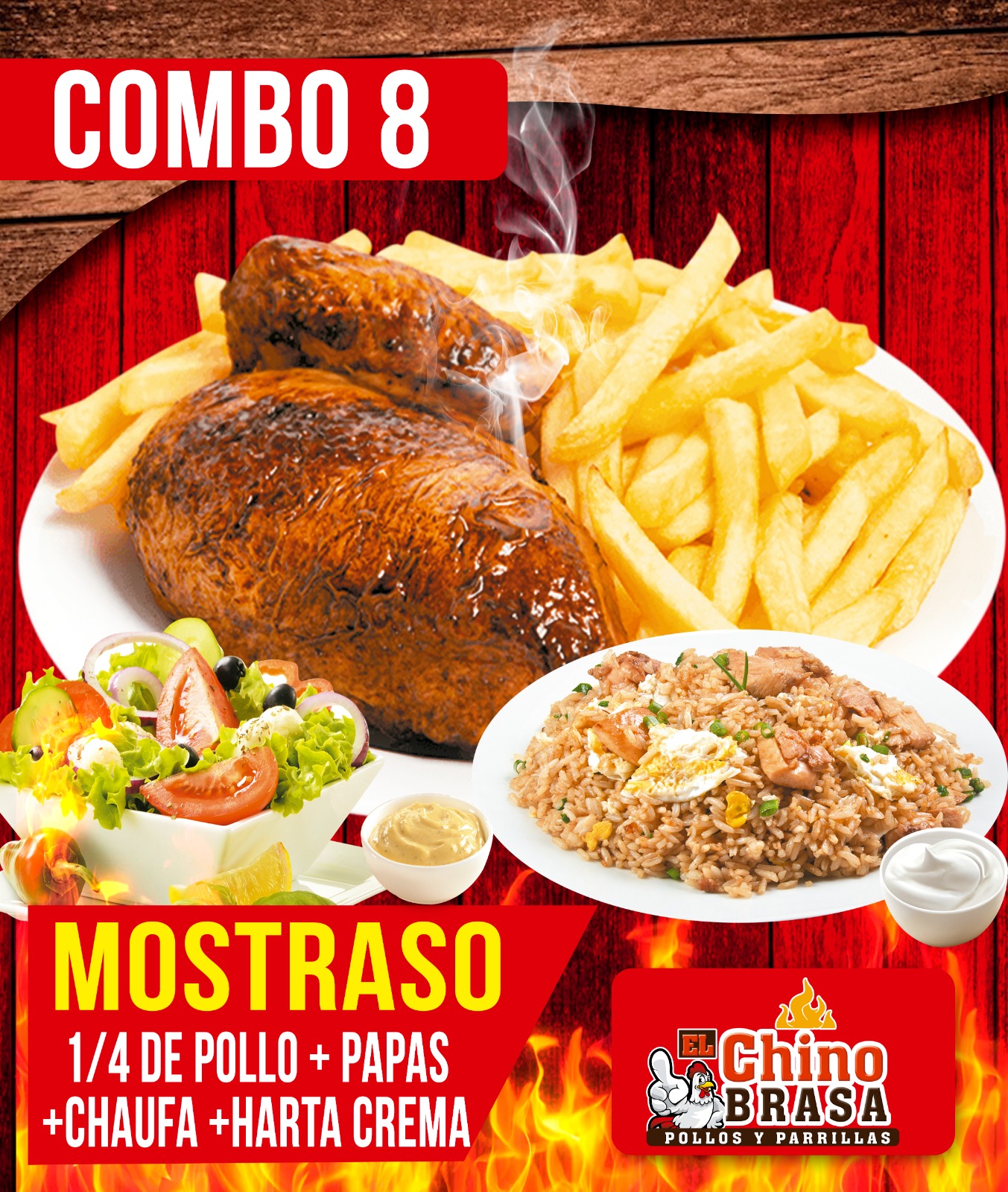 1/8 pollo a la brasa, chaufa, papas fritas, ensalada.