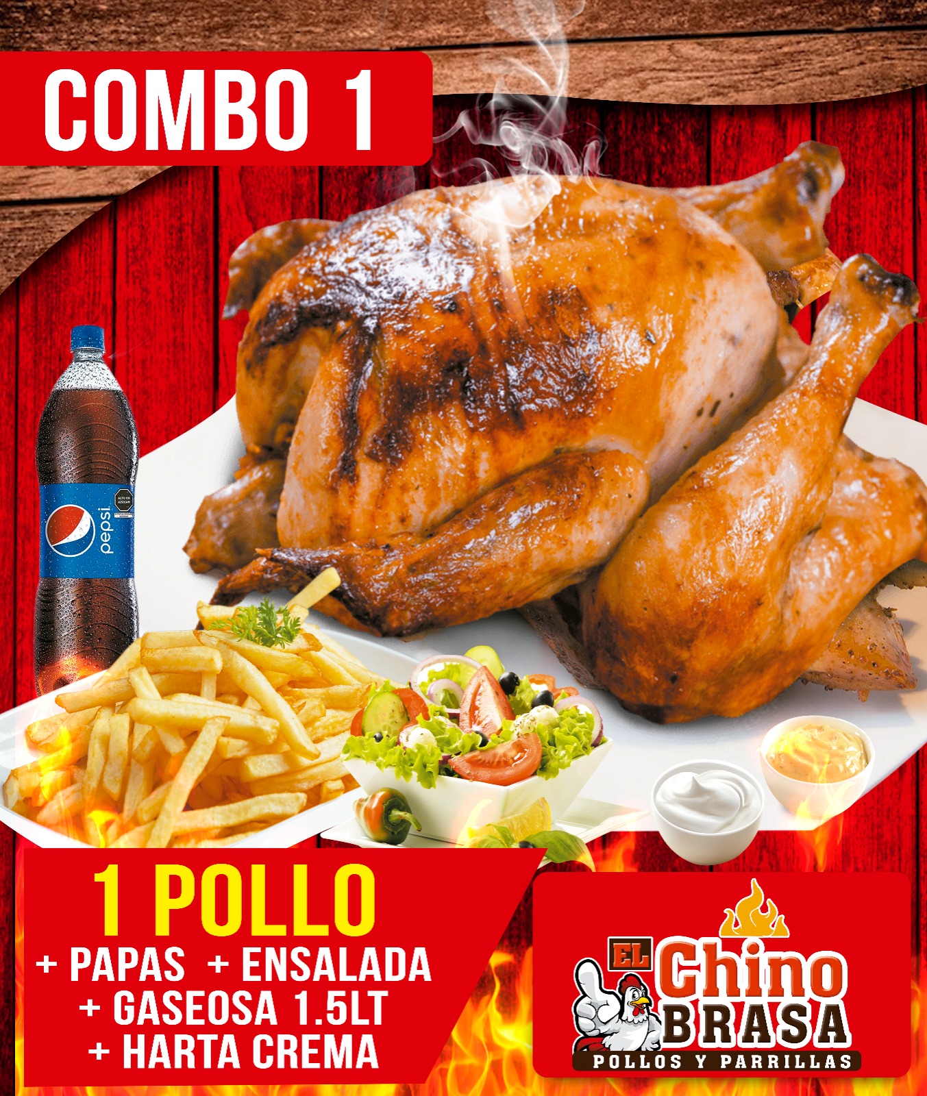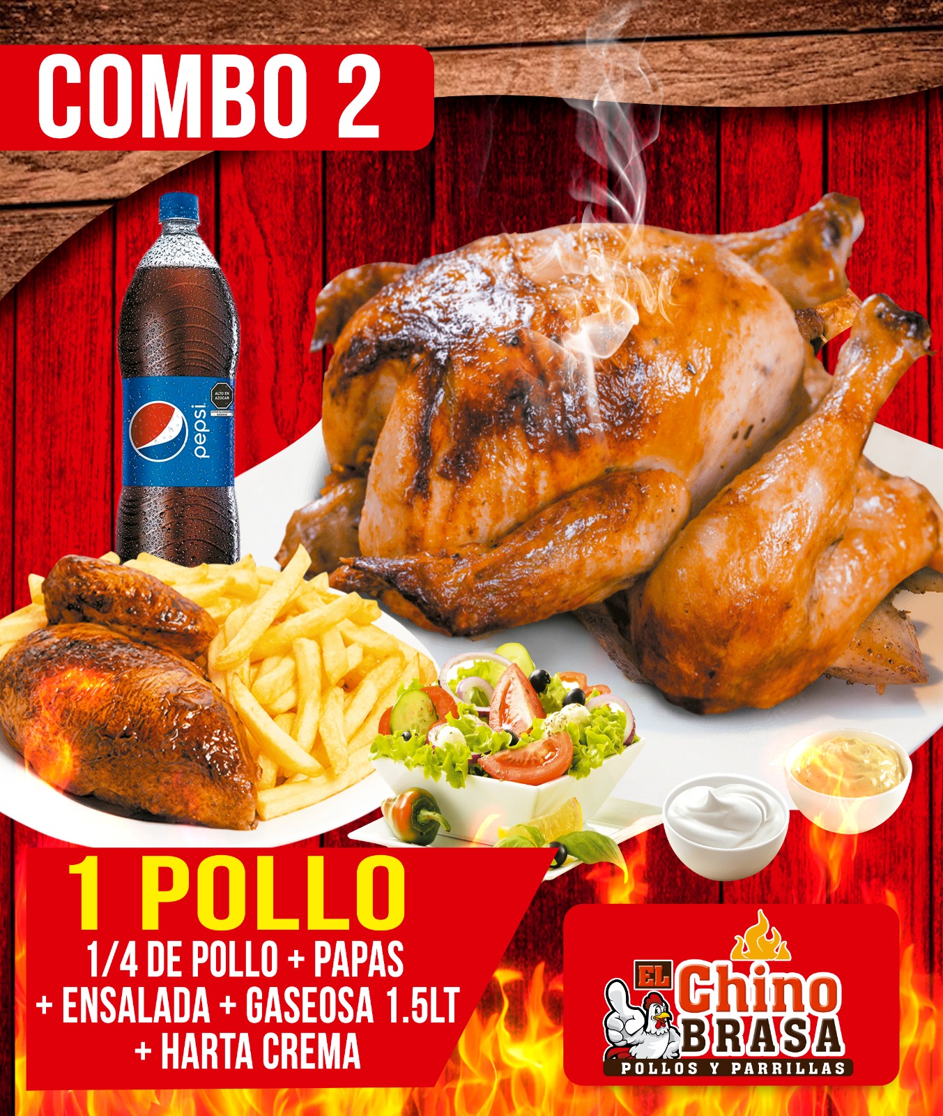 1 Pollo a la brasa, 1/4 pollo, papas fritas, ensalada, hartas cremas y Pepsi 1.5 L.