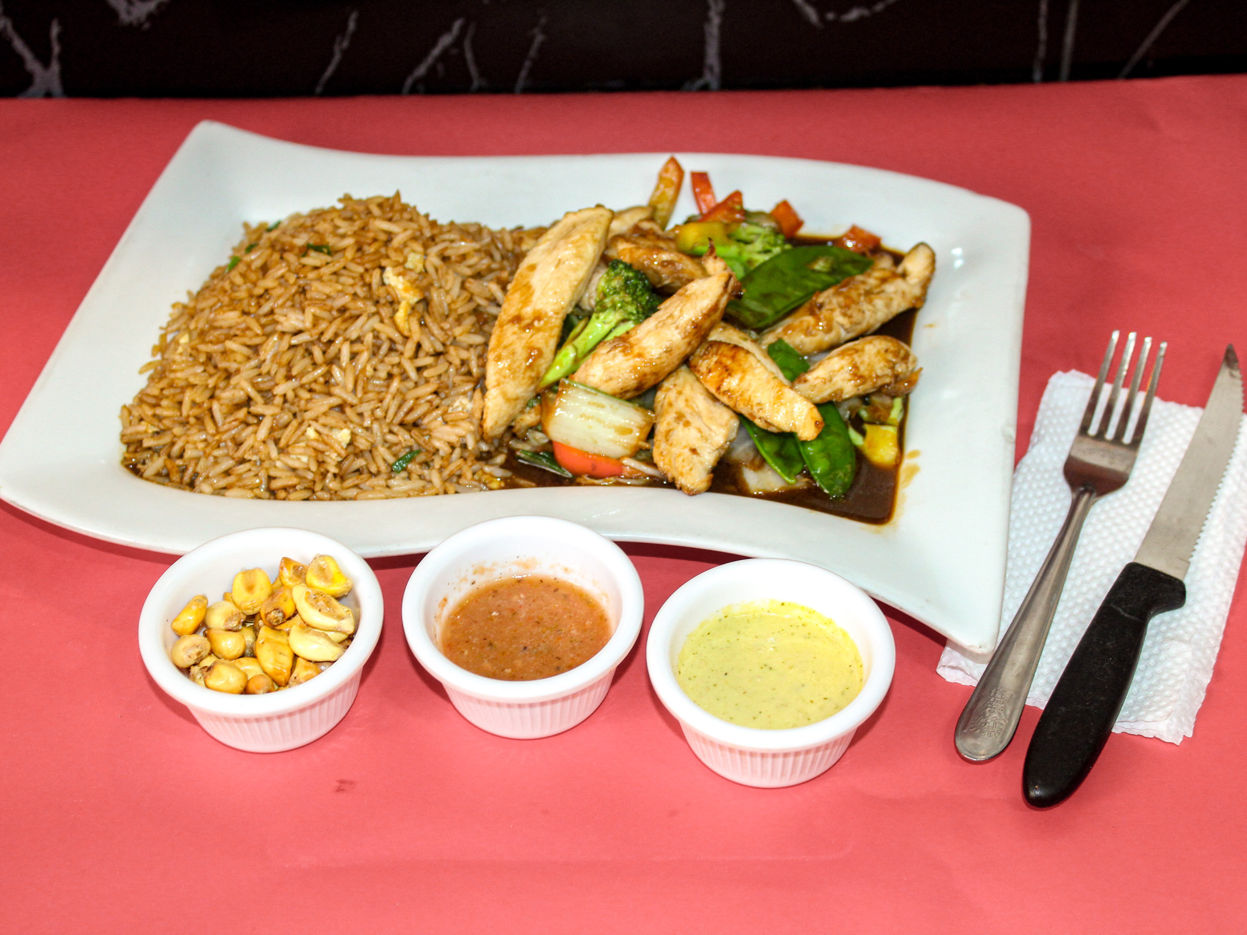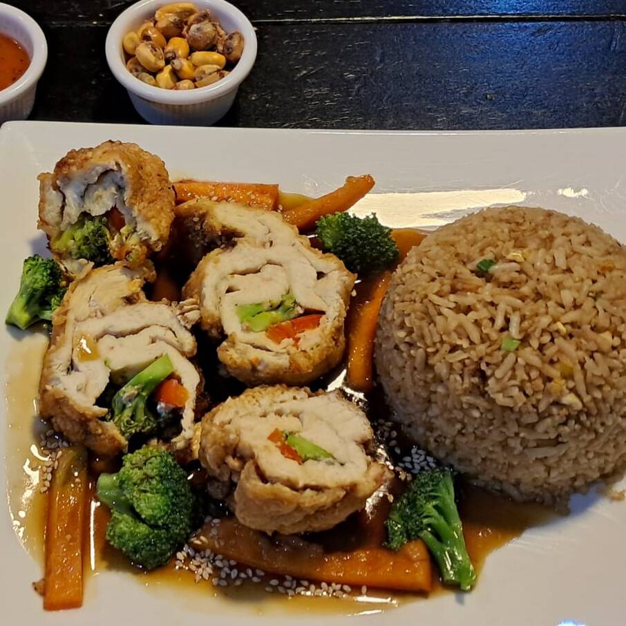 Arroz Chaufa + 01 Pieza grande de Pollo Enrollado acompañado de Salteado de verduras bañado en salsa de Ostión