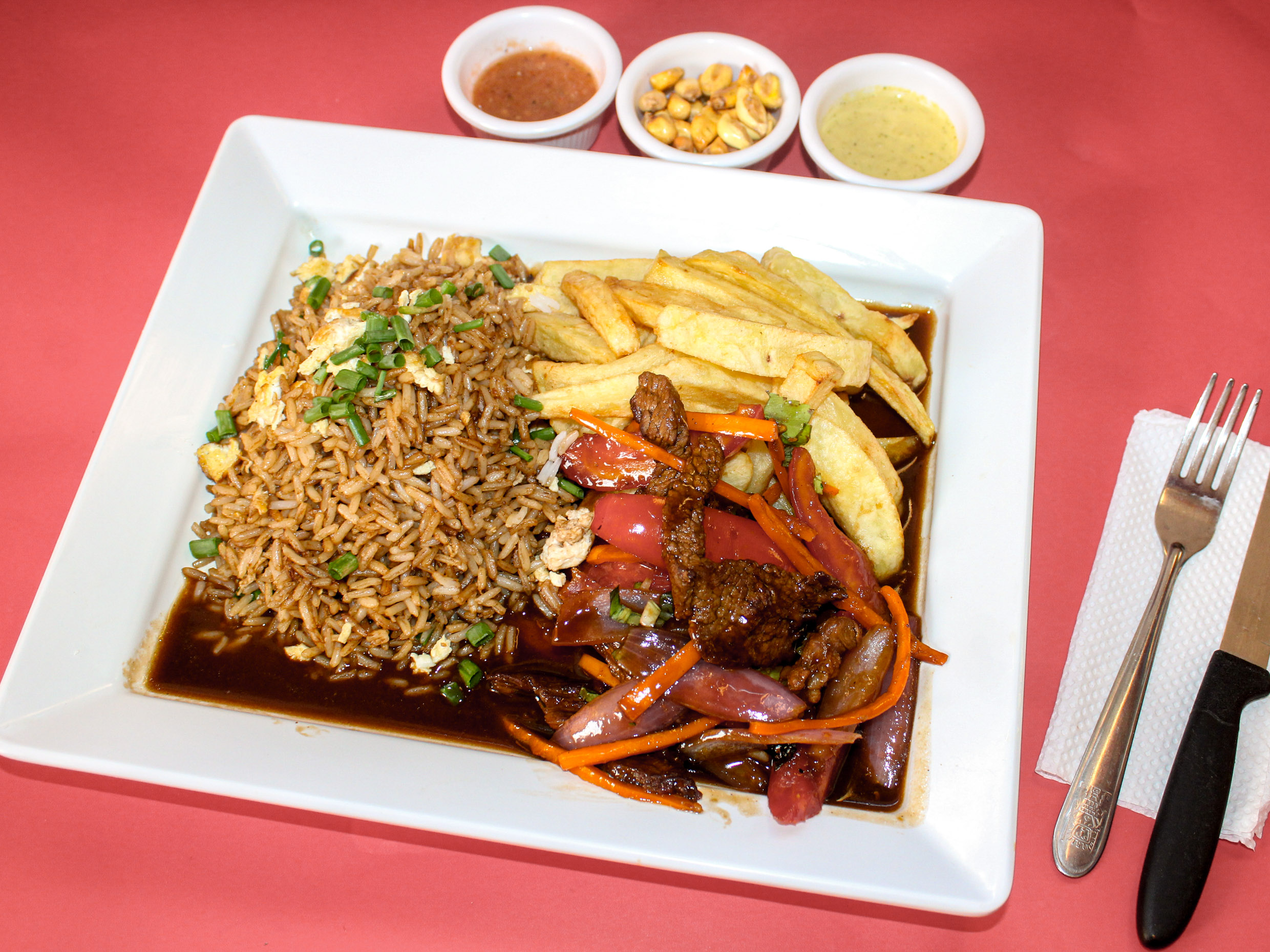 Lomo saltado de carne de res, acompañado de arroz Chaufa y Papas fritas. Bien Taypa!