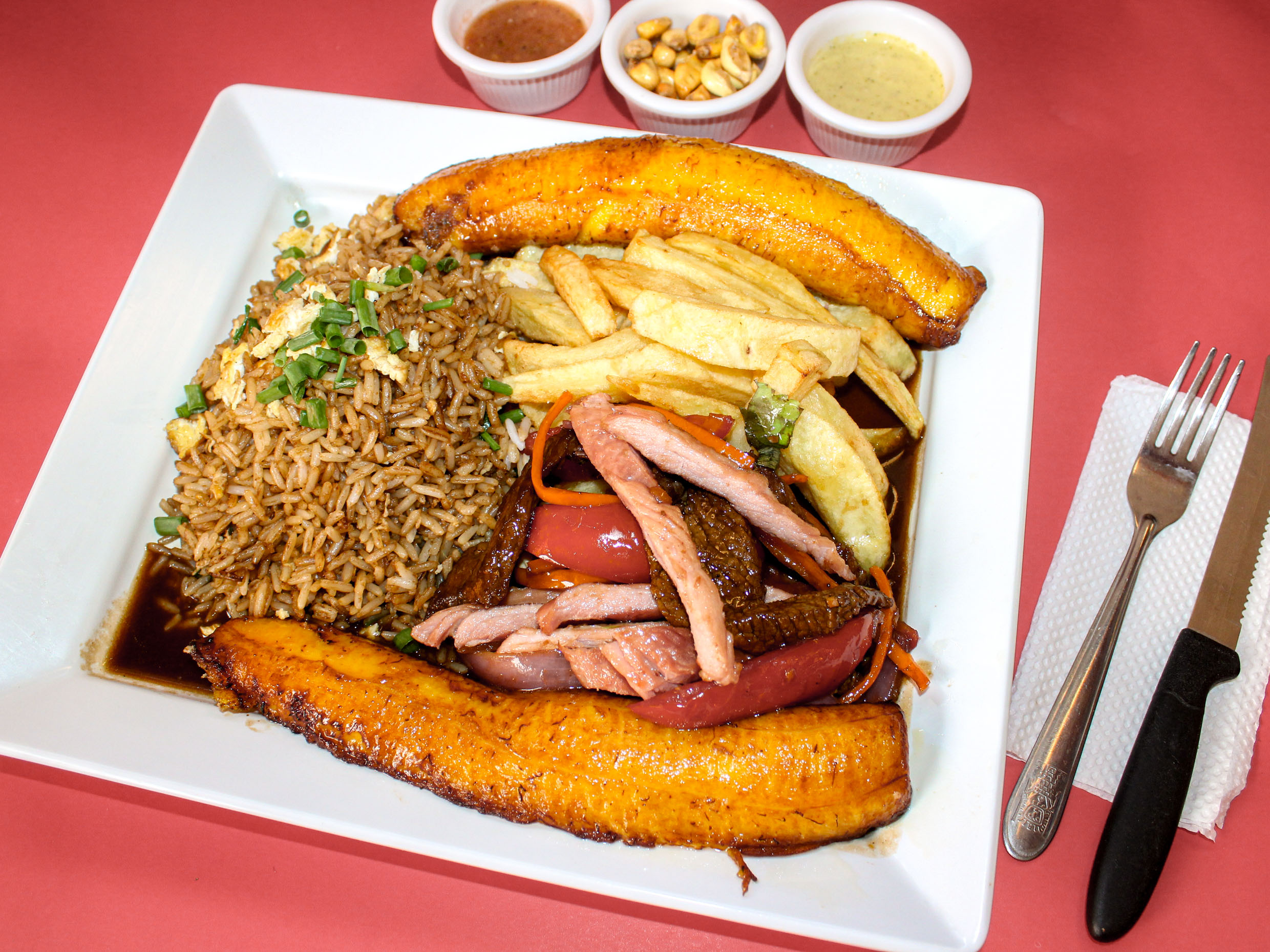 Saltado de Cecina y carne de res, acompañado de Arroz chaufa, Plátano frito y Ají de cocona. Sabor a selva!