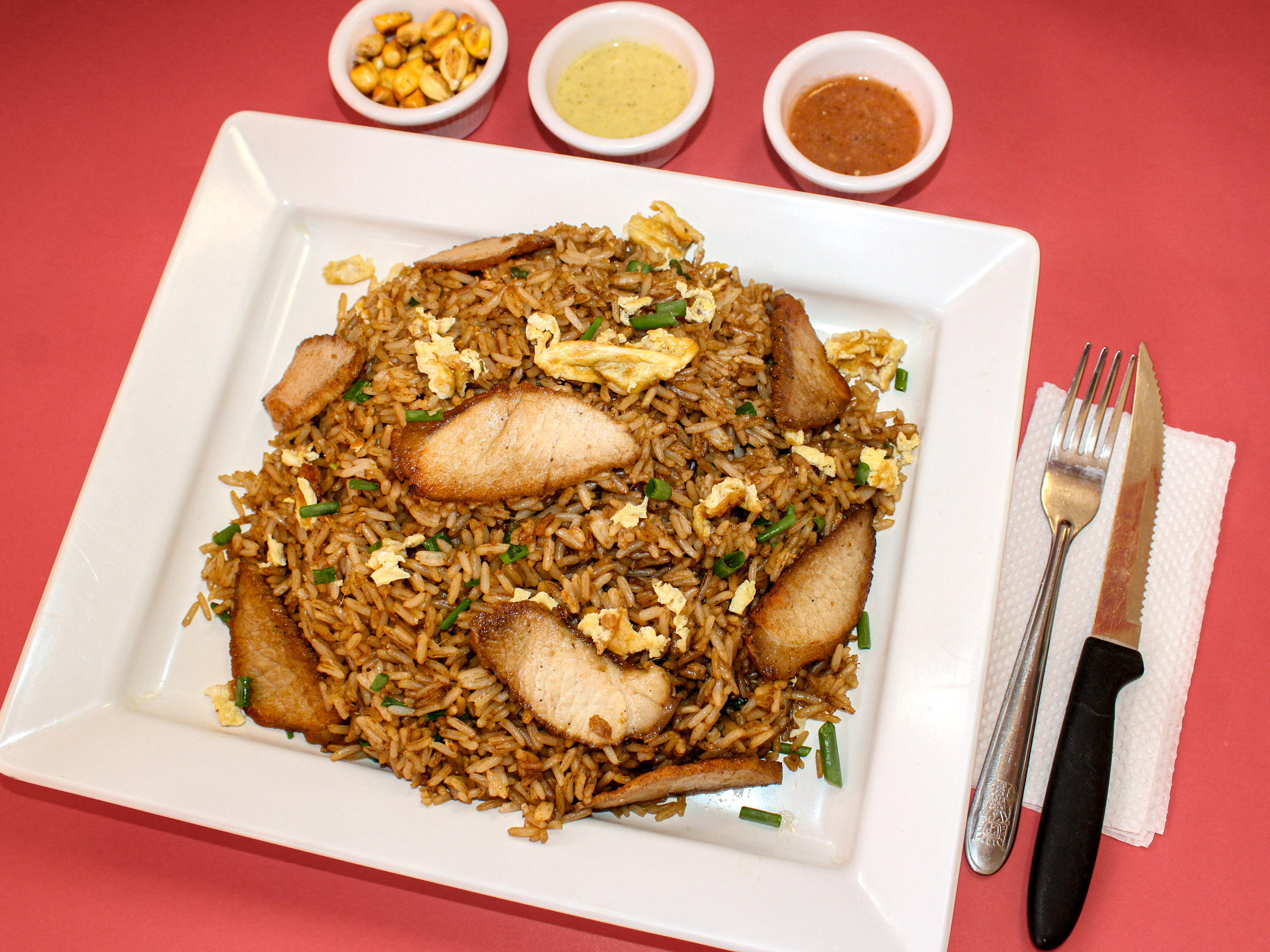 Arroz chaufa a base de cecina y chorizo regional, acompañado de Plátano frito y Ají de cocona