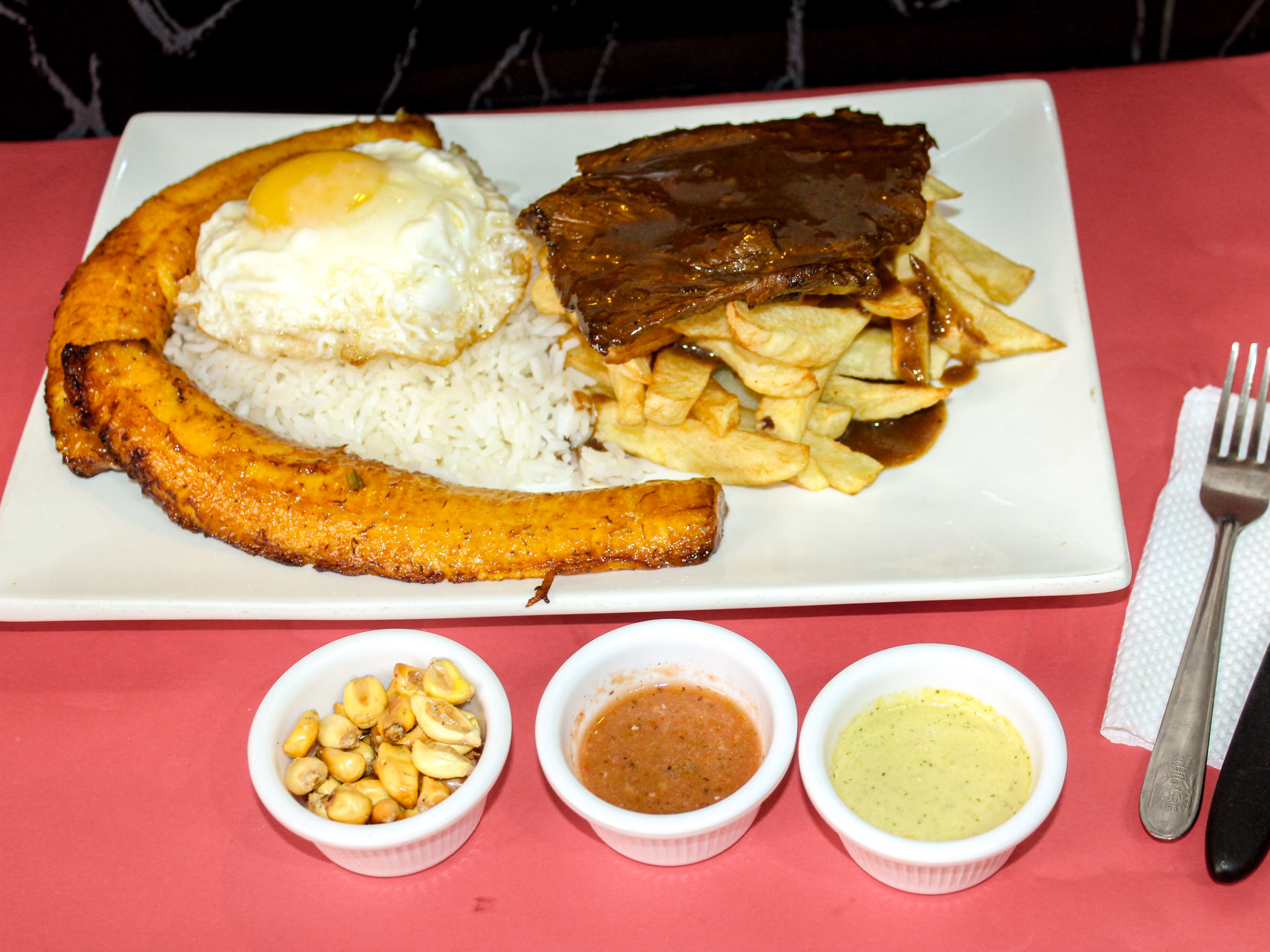 Bistec sazonado, acompañado de plátano frito, huevo frito y papas fritas.